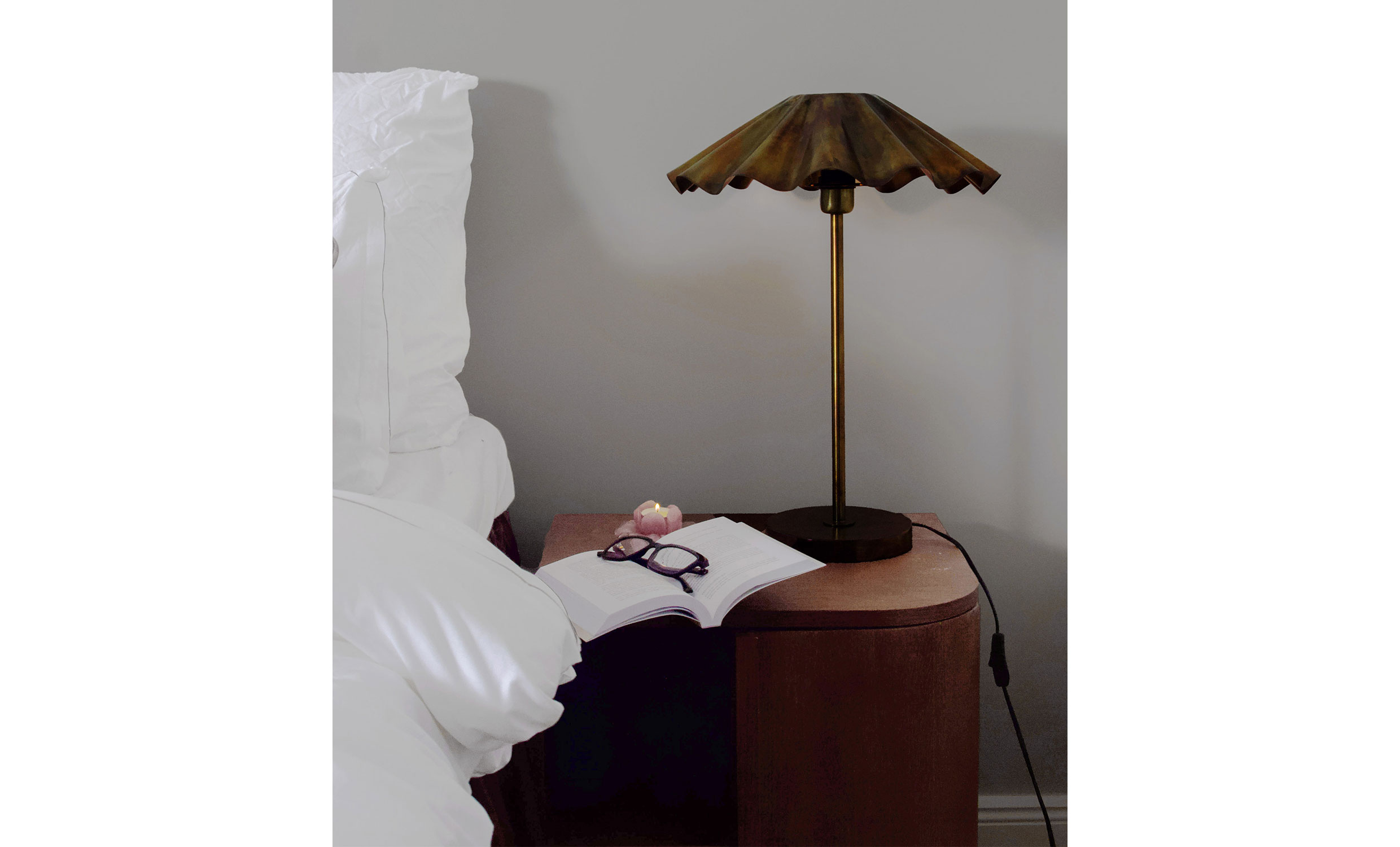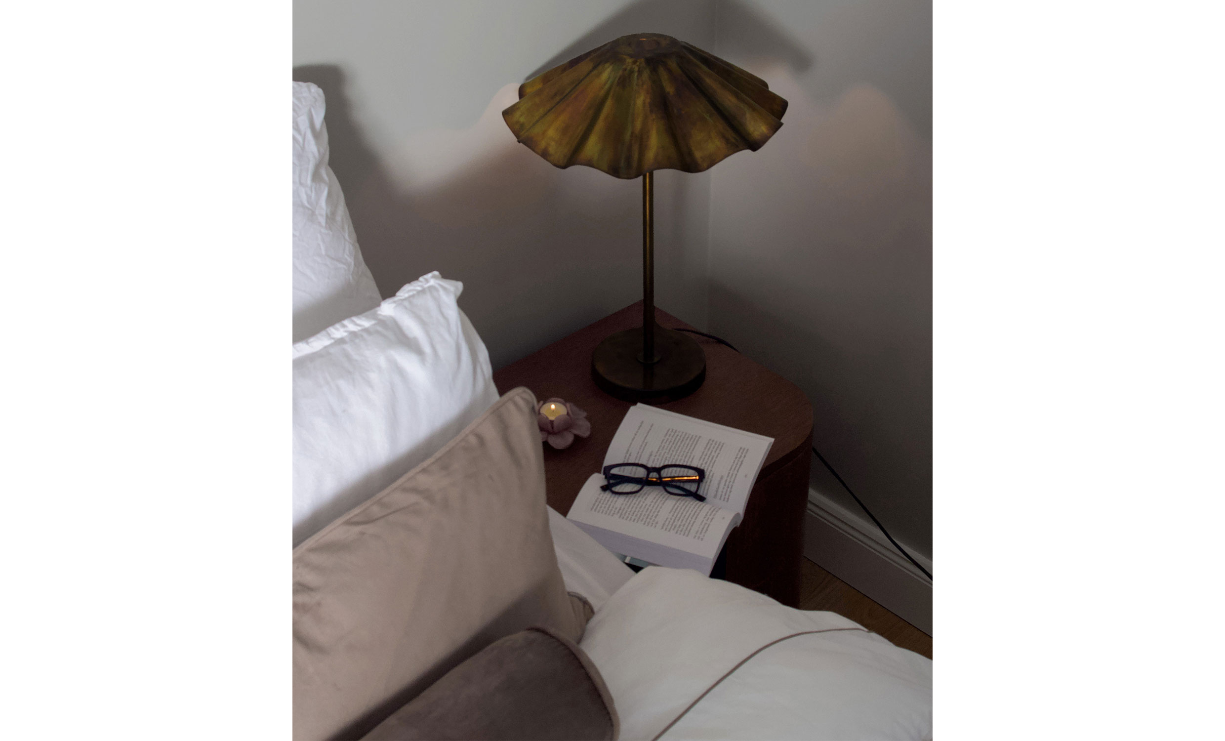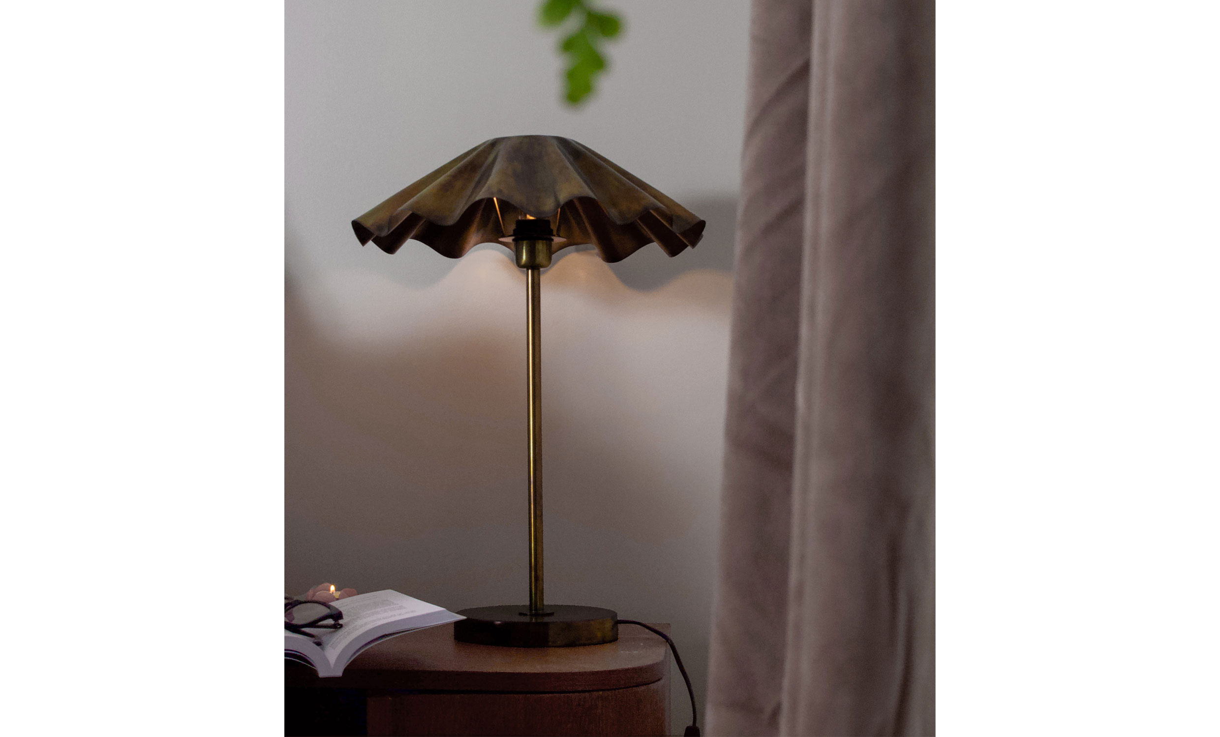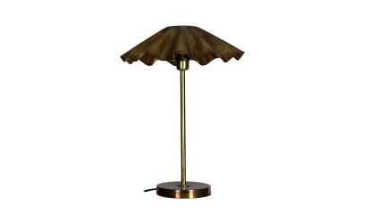 Aira är en iögonfallande bordslampa i metall med en unik bränd mässingsfinish. Ytan skimrar i levande toner av blått, grönt och koppar som förändras med ljuset och ger lampan ett exklusivt och konstnärligt uttryck. Den veckade lampskärmen, inspirerad av formen hos en bakform, skapar en lekfull struktur och sprider samtidigt ett mjukt och stämningsfullt ljus. Kombinationen av material och form gör lampan till en dekorativ detalj som passar perfekt i moderna hem.