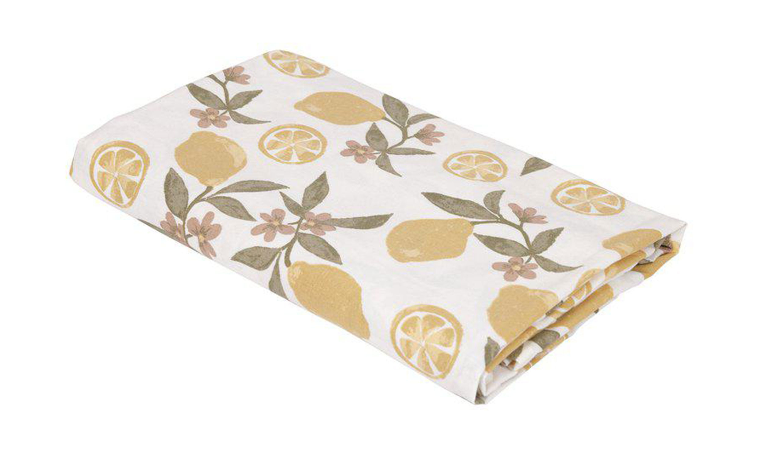 Amy är en akrylatbehandlad vaxduk som är tillverkad av återvunnen bomull och återvunnen polyester och pryds av ett ljuvligt citronmönster som ger dukningen en fräsch och somrig känsla. Det lekfulla motivet för tankarna till Medelhavets sol och värme och skapar ett inbjudande uttryck. Tyget är akrylatbehandlat och har egenskaper som liknar en vaxduk – vattenavvisande och lätt att torka av – samtidigt som det behåller en mjuk och mer tygliknande känsla.