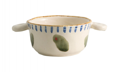 Olea är en charmig skål där funktion möter konstnärligt uttryck. De handmålade detaljerna i blått och grönt skapar ett levande och lekfullt intryck, medan de små handtagen ger både karaktär och praktisk användning. Varje skål formas och dekoreras för hand, vilket gör varje exemplar unikt – perfekt för servering eller som en dekorativ detalj på bordet.