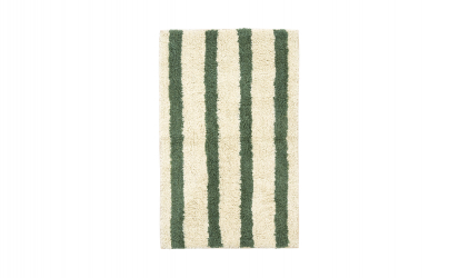 Denna randiga badrumsmatta i grönt och offwhite ger badrummet ett fräscht och somrigt uttryck. Den tuftade designen i mjuk, fluffig bomull känns behaglig under fötterna, medan baksidan i halkskyddande latex håller mattan stadigt på plats. En praktisk och stilren detalj som är anpassad för daglig användning.