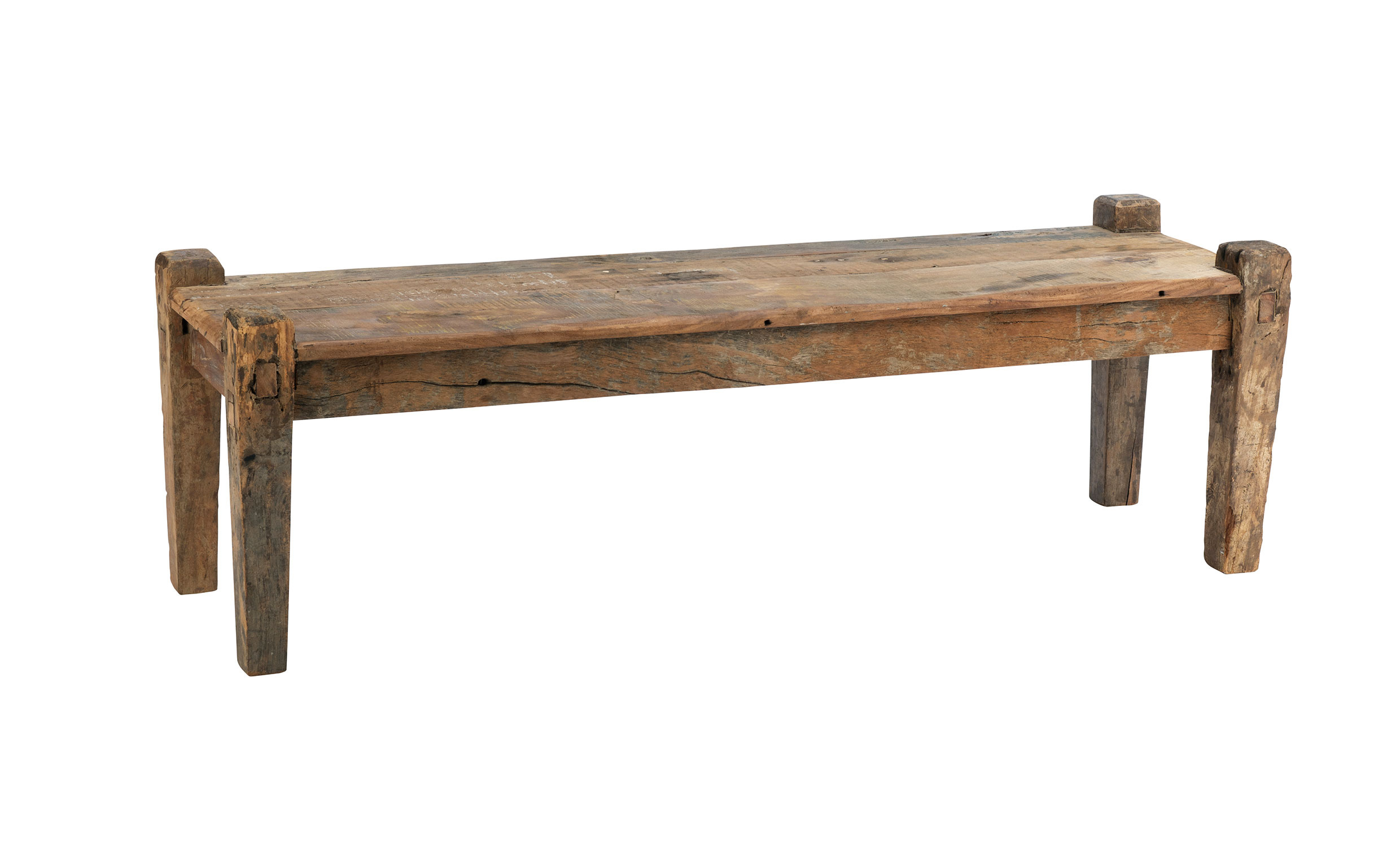 Denna återvunna träbänk i naturliga toner är tillverkad av återvunnet trä och återbrukade byggmaterial. De varierande trästyckena skapar en levande och unik yta med inspiration från klassiska indiska möbler. Perfekt som sittplats i hallen, sovrummet eller köket. Tillverkad i Jodhpur, som är ett centrum för arbete med återvunna material i Indien.