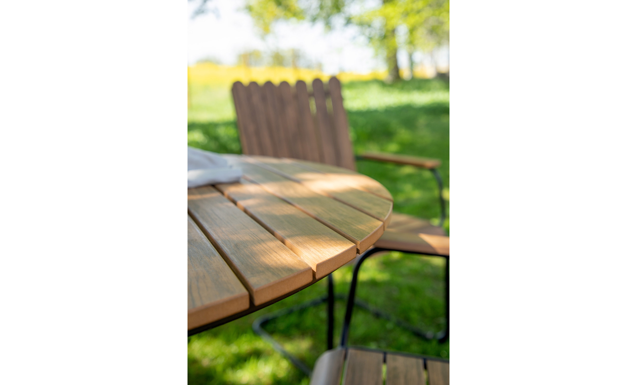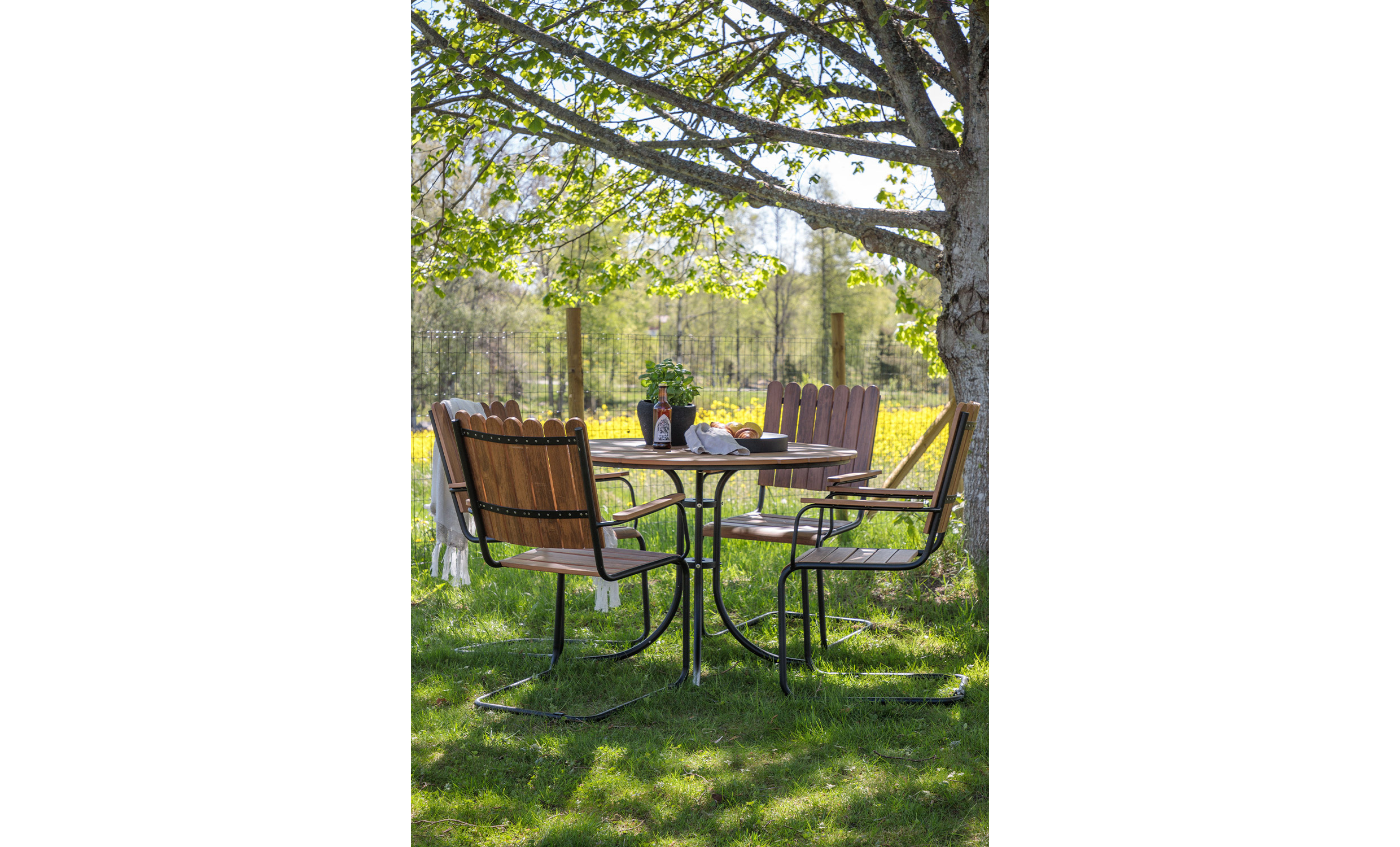 Beppe är en stilren och funktionell matgrupp för utomhusmåltider. Den naturfärgade bordsskivan med svarta ben ger en modern touch och smälter in i olika utomhusmiljöer. Med en diameter på 100 cm erbjuder bordet gott om plats för trevliga stunder med familj och vänner. Beppe är perfekt för både vardag och festliga tillfällen samtidigt som den är lätt att rengöra och underhålla.