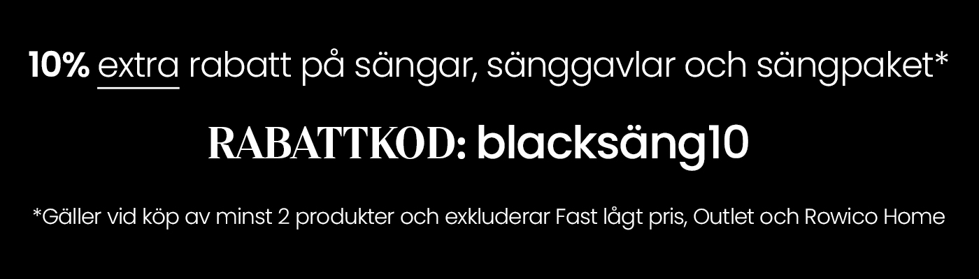 Använd koden blacksäng10 för 10% extra rabatt på sängar, sänggavlar och sängpaket. Gäller vid köp av minst 2 produkter och exkluderar Fast lågt pris, Outlet och Rowico Home samt kan inte kombineras med andra rabattkoder.