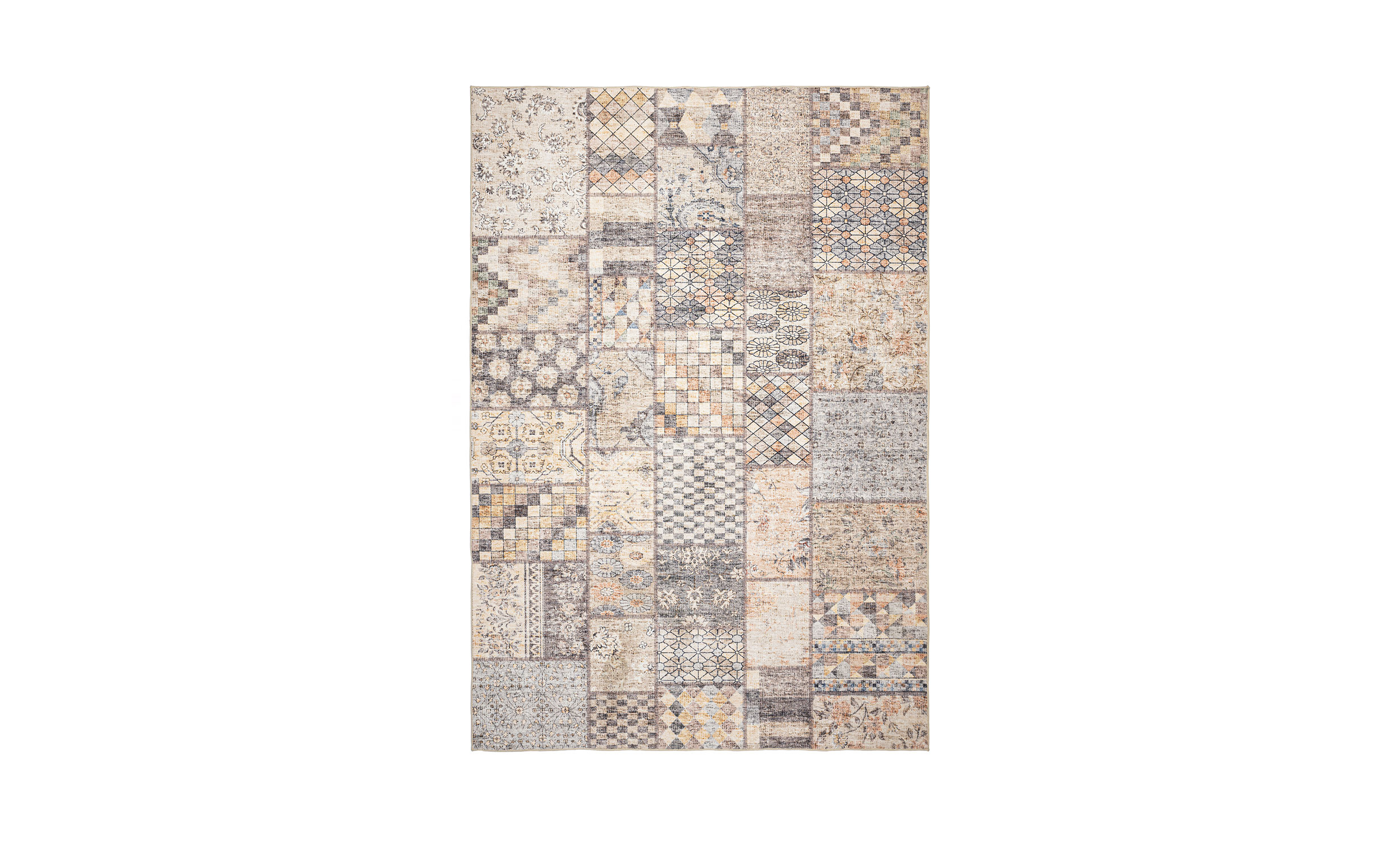 Carma är en dekorativ patchworkmatta i polyester med en struktur som påminner om linne eller canvas. De mjuka pastelltonerna skapar ett ljust och harmoniskt uttryck som ger rummet en ombonad känsla. Mattan har små gummidetaljer på baksidan som hjälper den att ligga stadigt på golvet. En lättplacerad och praktisk matta som passar lika fint i vardagsrum som i sovrum eller barnrum.
