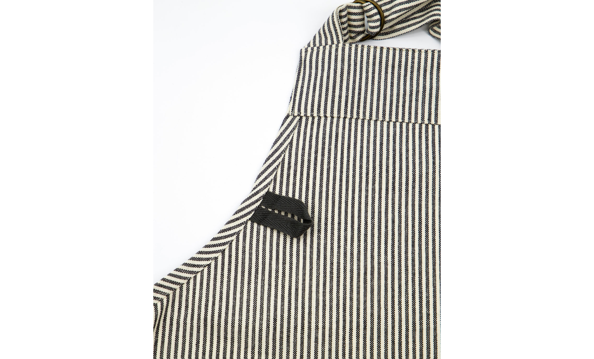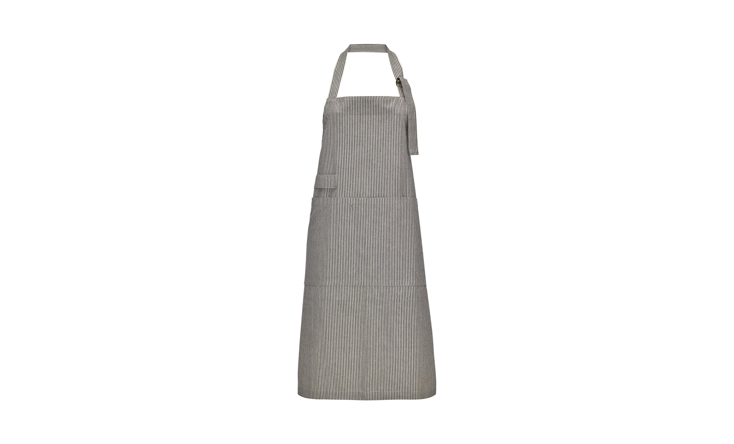 Detta mörkgrå förkläde ger köket en stilren och tidlös känsla. De garnfärgade ränderna i off-white och mörkgrått förstärker den klassiska designen. Med justerbar rem och praktisk ficka är det både bekvämt och funktionellt vid matlagning.