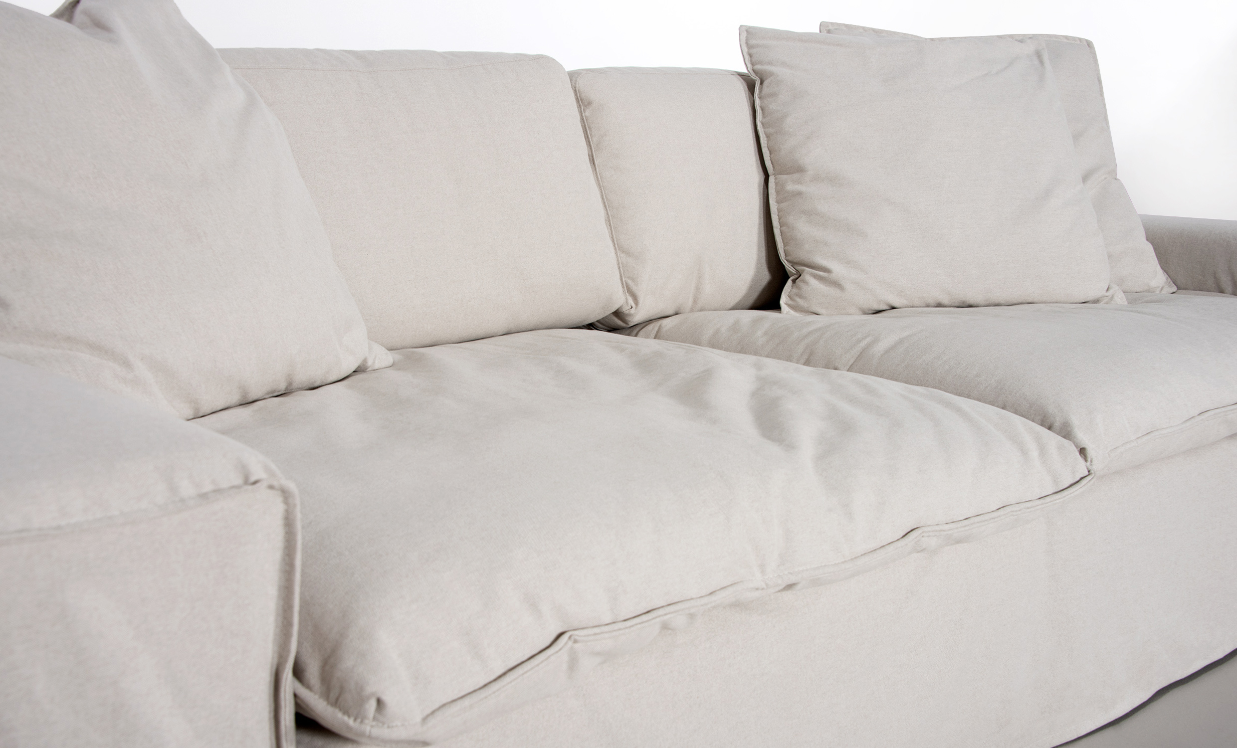 - Sitt- och ryggplymåer samt de tre prydnadskuddarna är fyllda med en blandning utav polyesterfiber och strimlat kallskum som ger en liknande känsla i komforten som en dunsoffa.