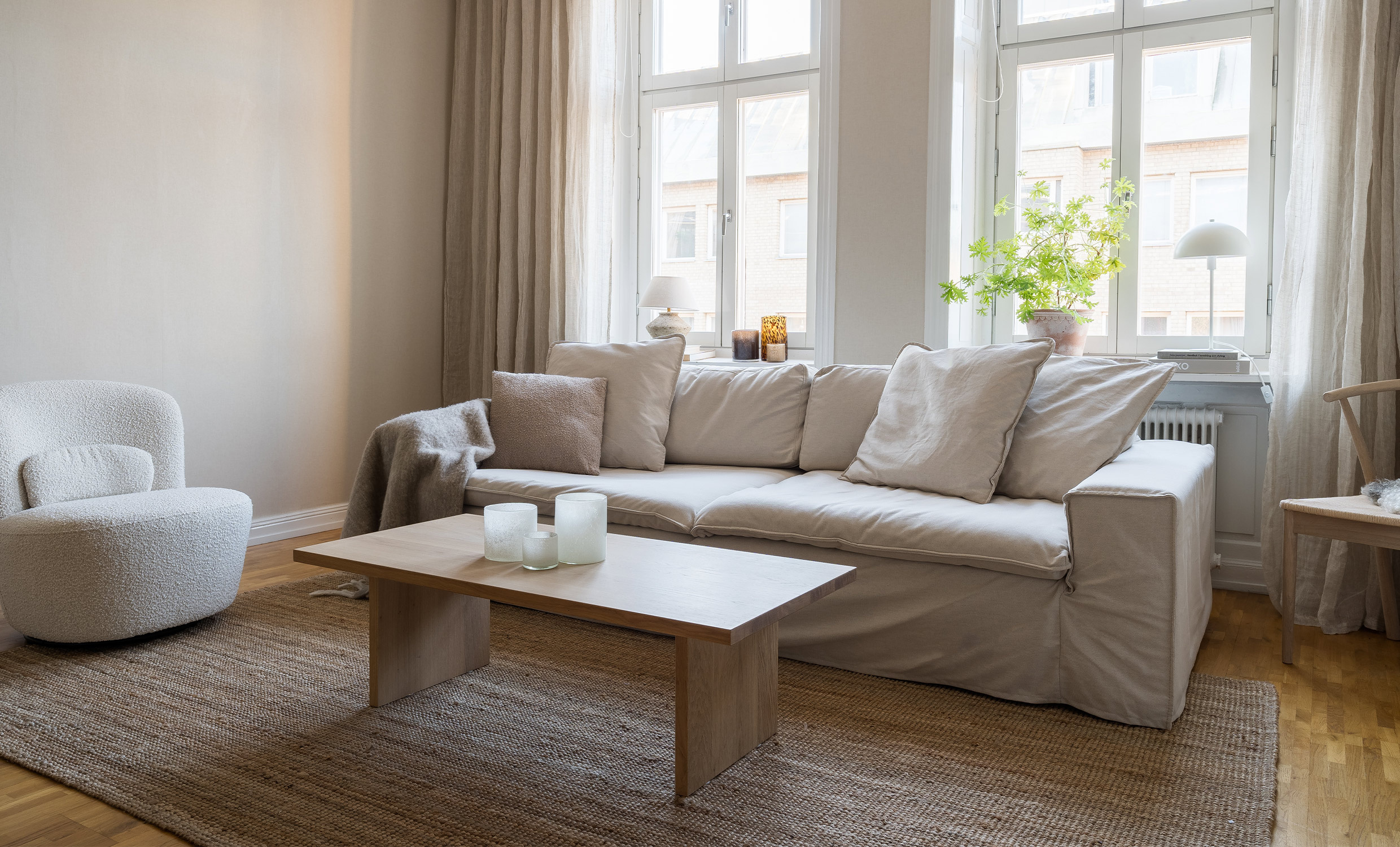 - Klädsel i 75% återvunnen bomull och 25% polyester, ett formbeständigt och slitstarkt material med mjuk och härlig linnekänsla. Tyget har en loose fit-effekt, det vill säga lite löst sittande, vilket bidrar ännu mer till linnekänslan.