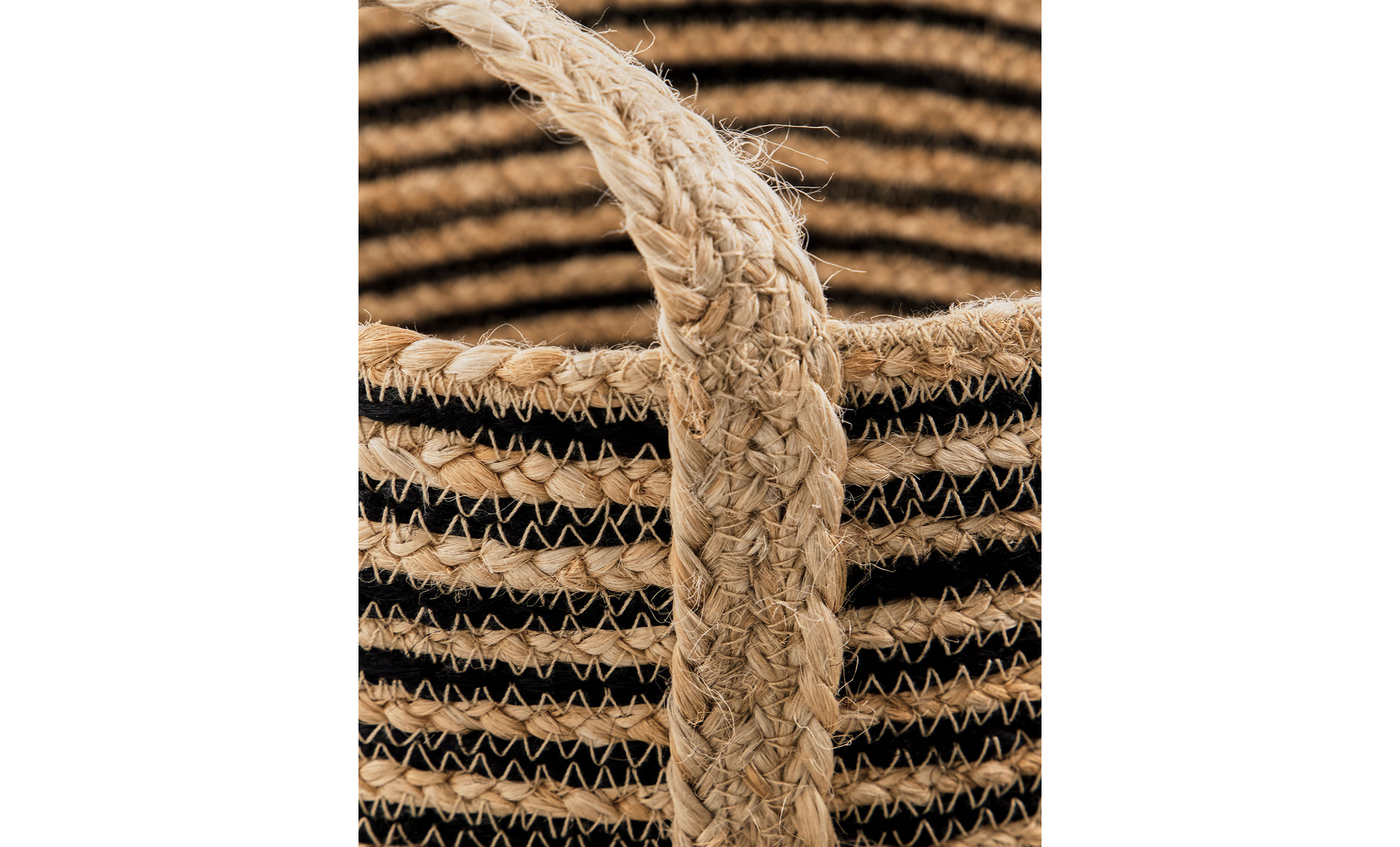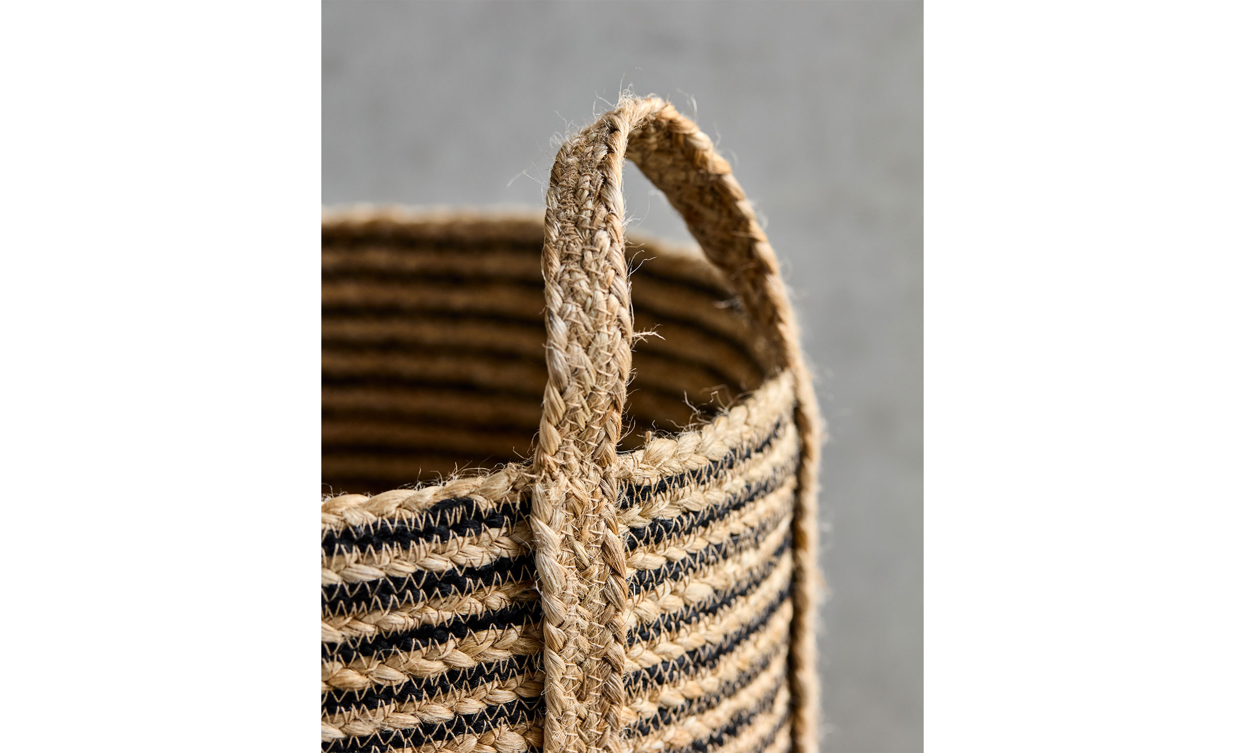 Dessa stilrena förvaringskorgar hjälper dig att skapa ordning på ett både praktiskt och dekorativt sätt. Korgarna är handgjorda i jute med kontrasterande svarta ränder som tillför struktur och visuell karaktär. De praktiska handtagen gör dem enkla att flytta och placera där du behöver extra förvaring.