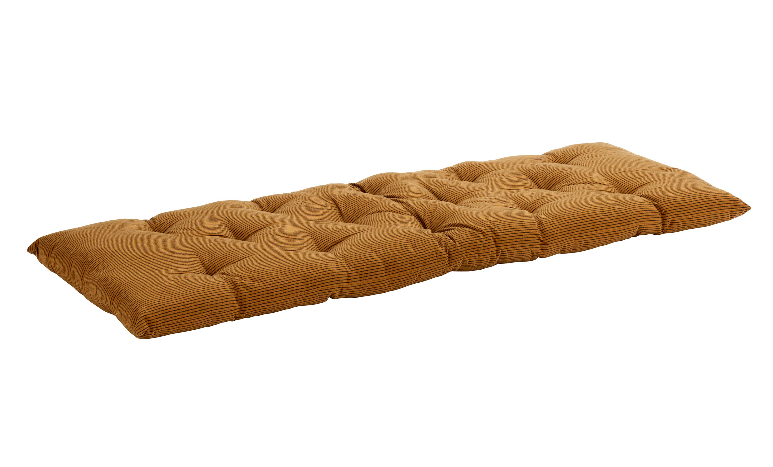Denna bänkdyna har en vacker färgkombination i rostbrun bas och svarta smala ränder. Tillverkad i slitstark bomull med fyllning av bomull och återvunna tygrester är den ett mer hållbart val för hemmet. Storleken passar de flesta bänkar och ger både färg och komfort – lika fin inomhus som på terrassen. Matchande kuddfodral finns i samma serie för en enhetlig helhet.