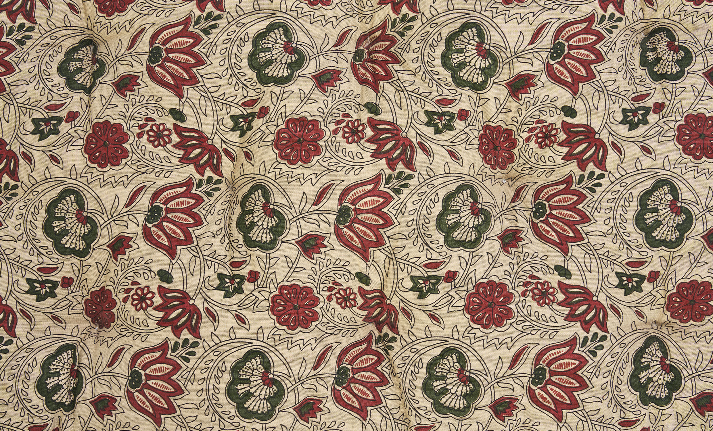 Denna tryckta bomullsmadrass, tillverkad i södra Indien, ger både färg och komfort till bänkar, antingen inomhus eller på terrassen. Den finns i nyanserna sand, torkad tomat och grönt, och pryds av traditionella indiska blocktryck. Fyllningen består av hållbart återvunnen bomull.