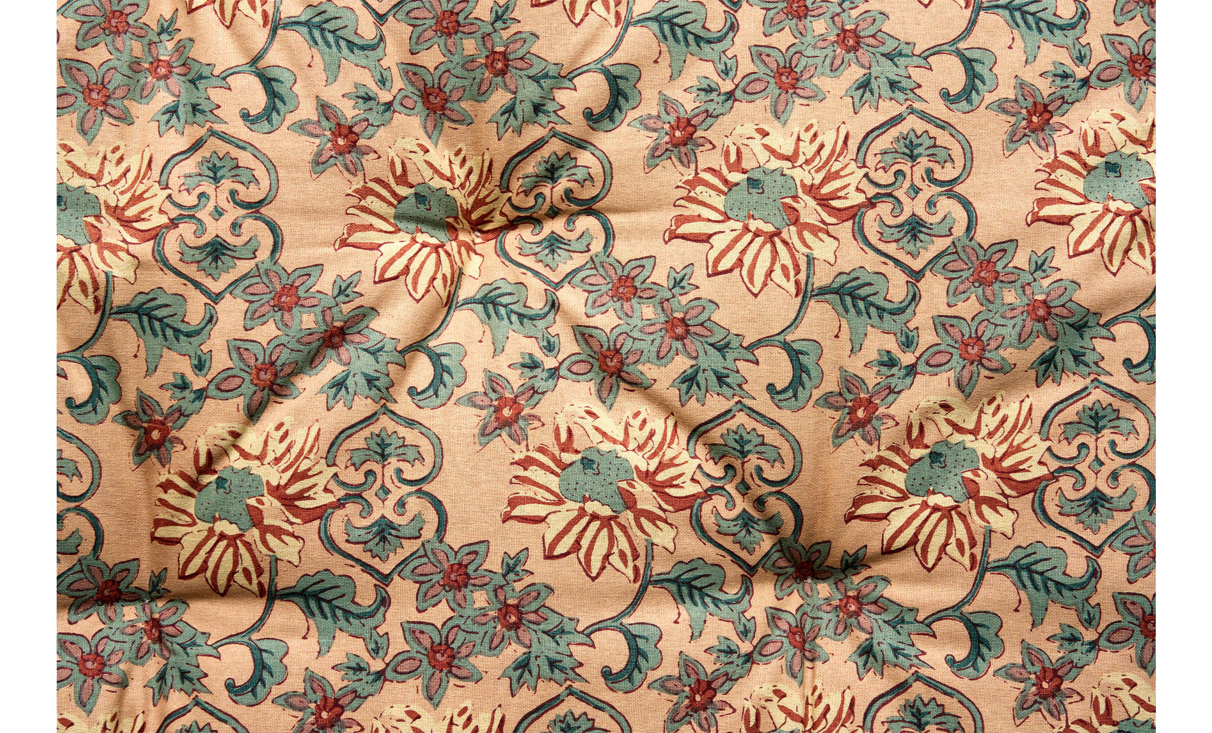 Denna dyna i bomull har toner av persikorosa, havsgrönt, brunt och sand. Dynan har ett romantiskt blommotiv i mjuka, dämpade toner. Tillverkad i slitstark bomull med fyllning av bomull och återvunna tygrester är den ett mer hållbart val. Perfekt för att klä stolar, fräscha upp soffan, skapa en avslappnad hörna på terrassen eller användas direkt på golvet. Matchande kuddfodral finns i samma serie.
