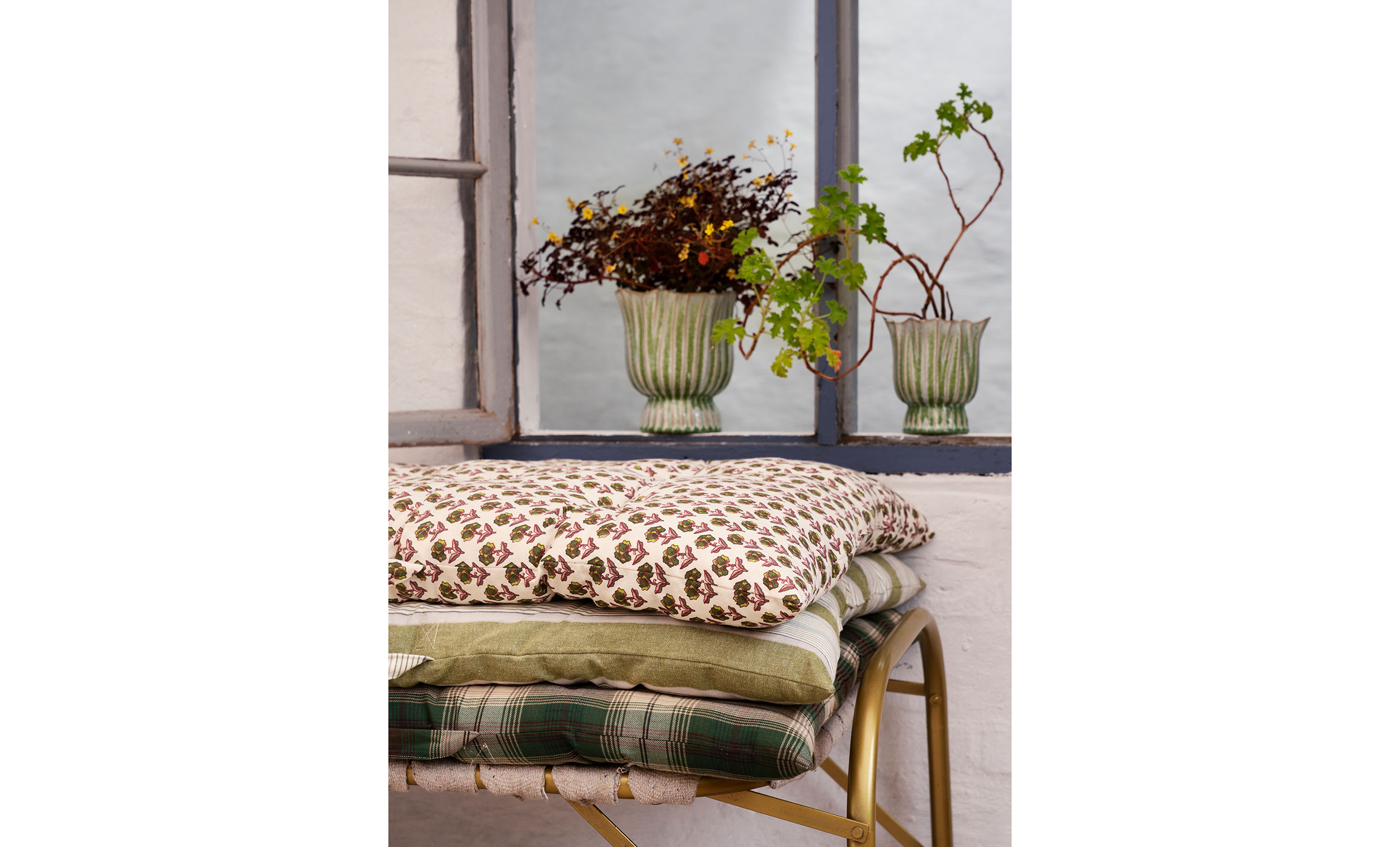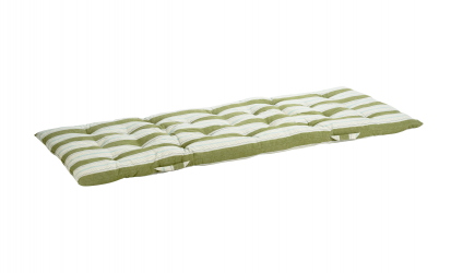 Denna randiga dyna i bomull tillför mjuka sommartoner i grönt, vitt, ljusblått och grått. Tillverkad i slitstark bomull med fyllning av bomull och återvunna tygrester är den ett mer hållbart val. Placera den på dagbädden, i soffan, på terrassen eller direkt på golvet för en avslappnad och inbjudande känsla. Matchande kuddfodral och stolsdynor finns i samma serie.