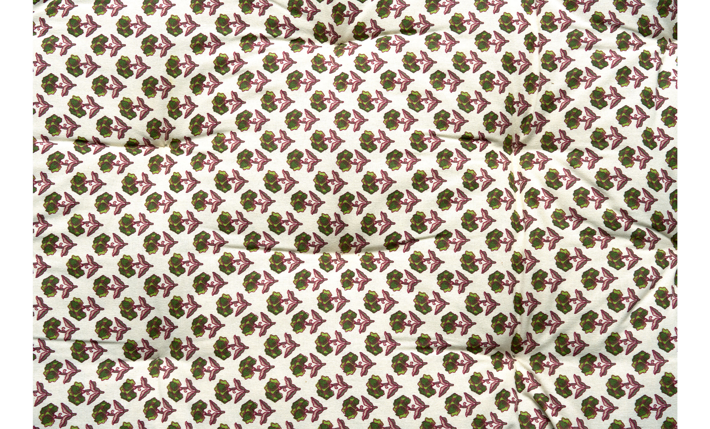 Denna mönstrade dyna i bomull tillför mjuka sommartoner i offwhite, grönt och vinrött till hemmet. Det dekorativa motivet är inspirerat av traditionella indiska blocktryck och skapar ett varmt, levande uttryck. Tillverkad i slitstark bomull med fyllning av bomull och återvunna tygrester är den ett mer hållbart val. Placera den på dagbädden, i soffan, på terrassen eller direkt på golvet för en avslappnad och inbjudande känsla. Matchande kuddfodral och stolsdynor finns i samma serie.