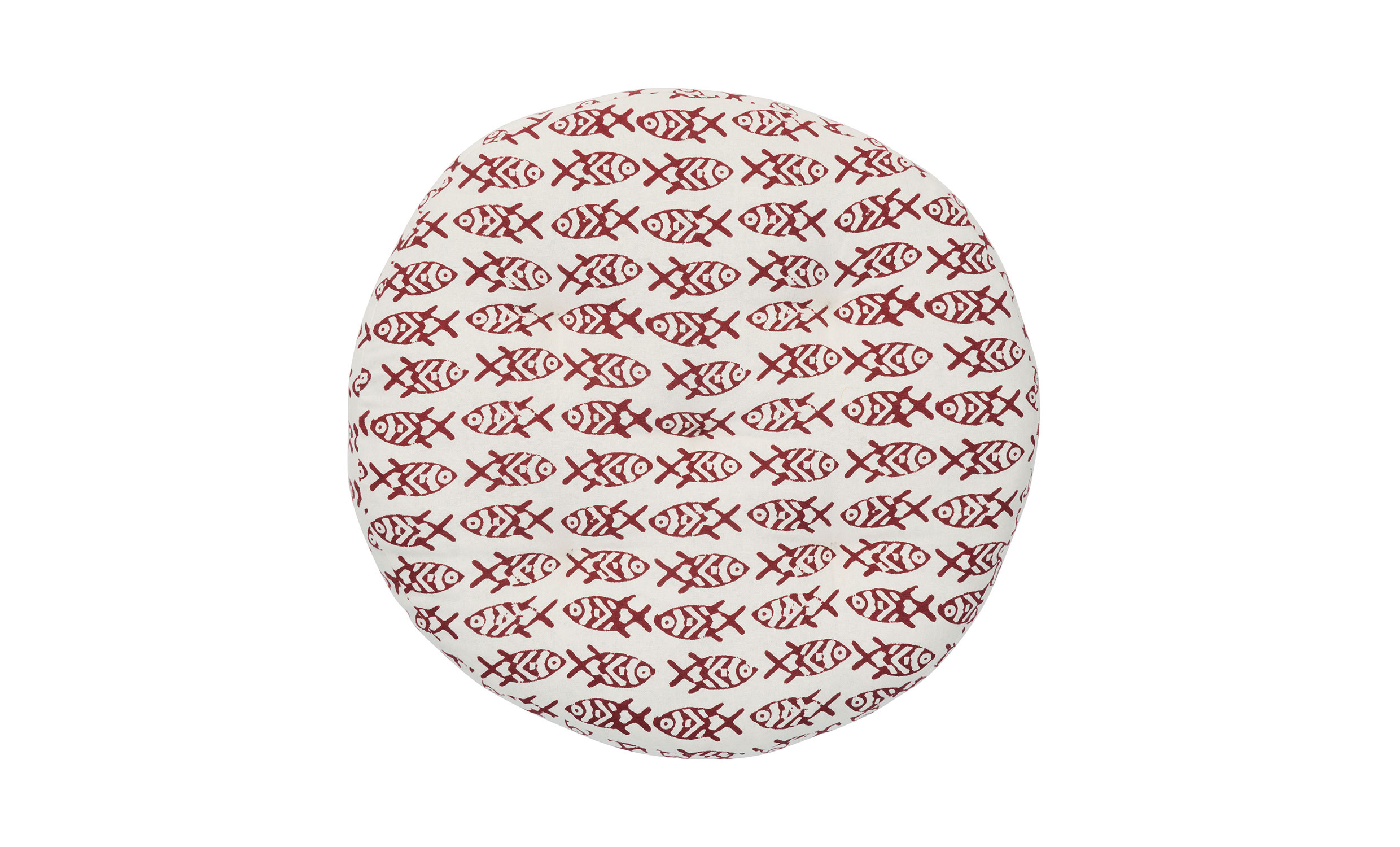 Ge din sittplats en lekfull och kustnära känsla med denna runda stolsdyna i offwhite och brunrött. Det dekorativa fiskmönstret är inspirerat av traditionella indiska blocktryck och tillför både karaktär och färg. Dynan är tillverkad i slitstark bomull och fylld med återvunna bomullsrester – ett mer hållbart val. Perfekt för matstolar, arbetsplatser, läshörnor eller som en mjuk detalj utomhus under sommarens varma dagar.