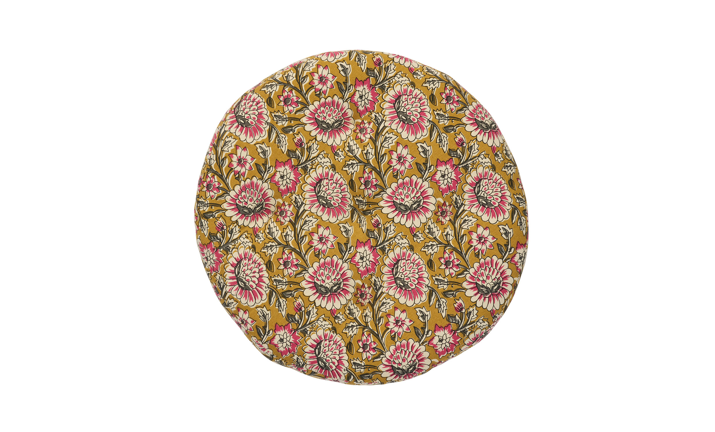 Denna runda stolsdyna i bomull tillför både färg och komfort till din sittplats. Det djärva blommönstret i senapsgult, offwhite, grått och hallonrött är inspirerat av traditionella indiska blocktryck och skapar ett levande men balanserat uttryck. Dynan är tillverkad i slitstark bomull och fylld med återvunna bomullsrester – ett mer hållbart val för hemmet. Passar perfekt på matstolar, i arbetsutrymmen, läshörnor eller på en solig terrass och matchar kuddfodral i samma serie.