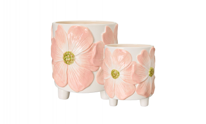 Esther är ett set med två krukor i dolomit med en mjuk ljusrosa ton med dekorativt blommönster som ger hemmet ett fräscht och livfullt uttryck. De två storlekarna skapar en fin dynamik och gör det enkelt att arrangera växter tillsammans eller var för sig. Perfekta för fönsterbrädan, hyllan eller sidobordet där du vill tillföra färg och lätthet.