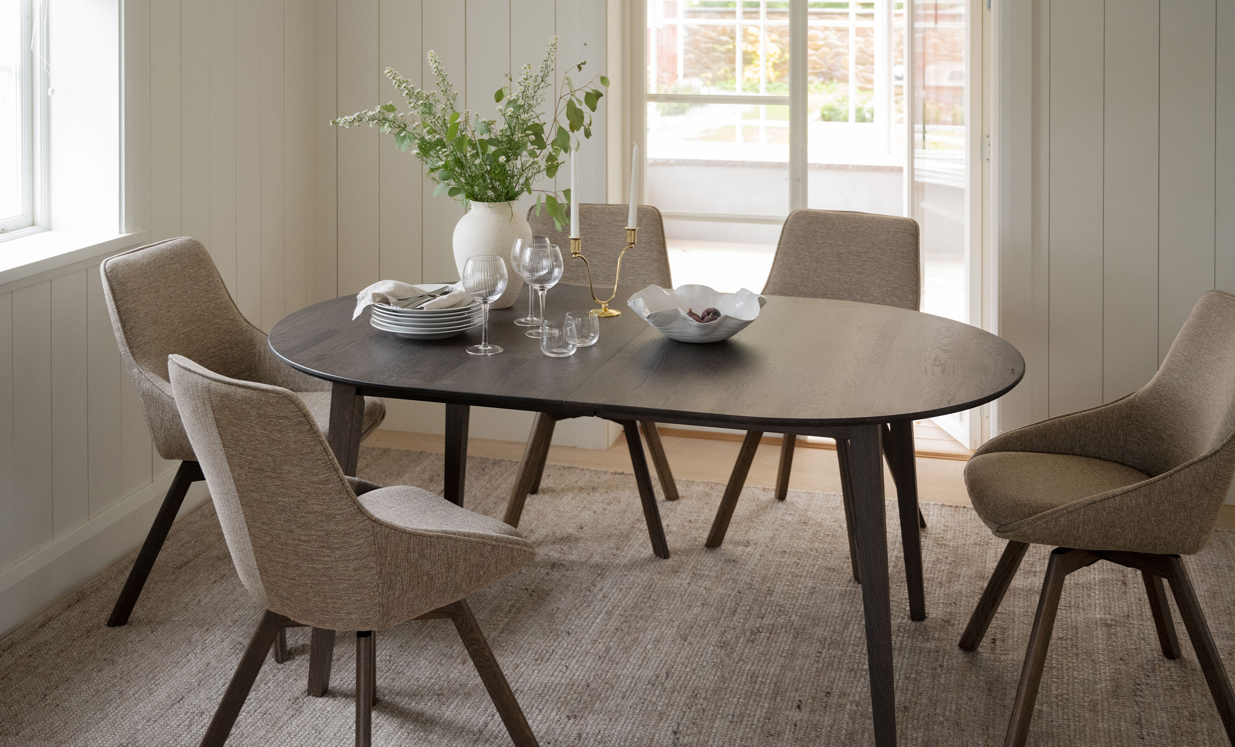 Ett vackert ovalt matbord från Rowico med plats för många bordsgäster då matbordet går att förlänga med den tillhörande iläggsskivan. Bordet har till och med plats för två iläggsskivor där det går att köpa till den extra iläggsskivan separat. Totalt kan matbordet få en maxlängd på 250 cm. Detta vackra och moderna matbord passar perfekt in i det moderna skandinaviska hemmet.
