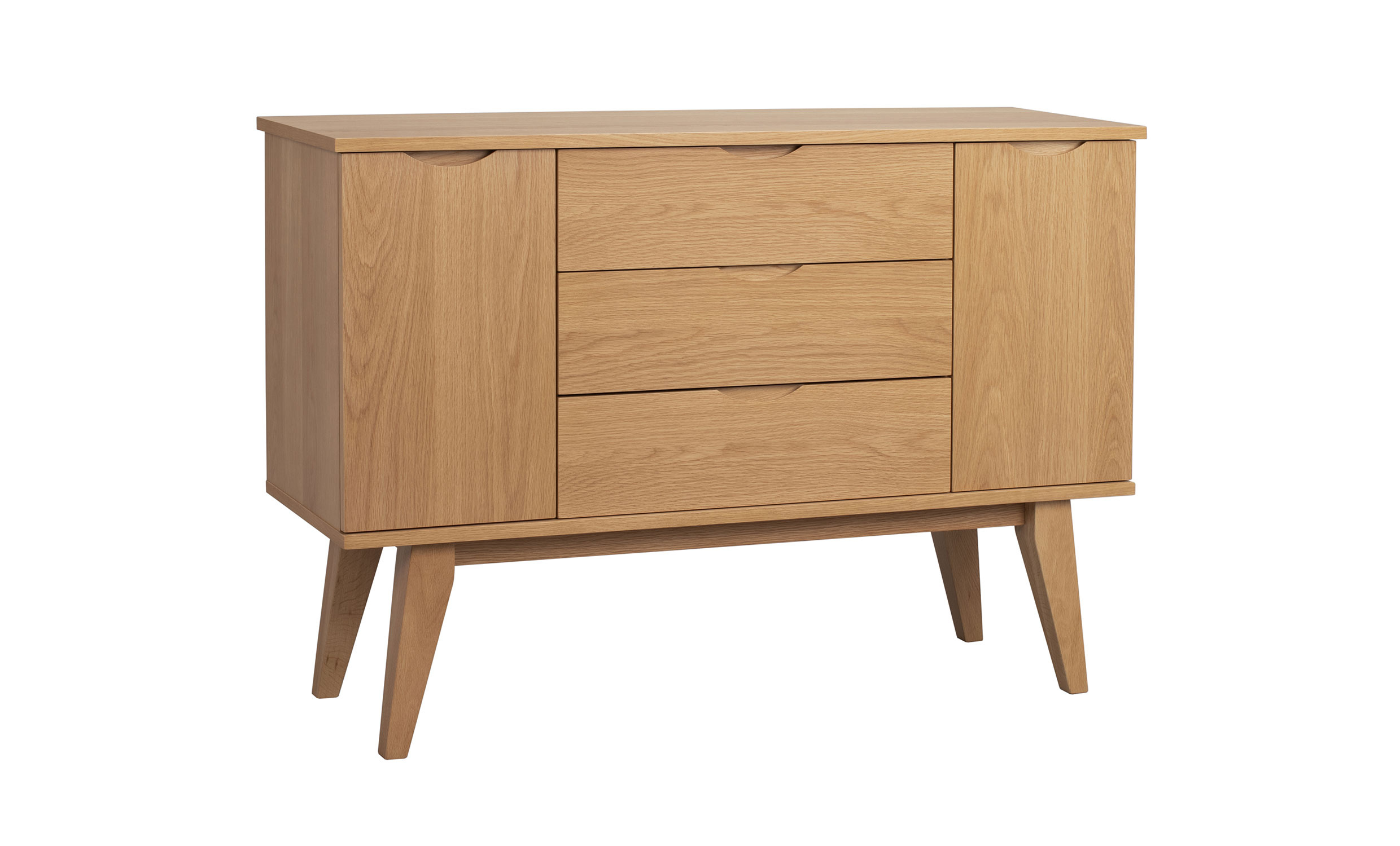 Filippa sideboard kombinerar en generös förvaring med tidlös skandinavisk design. Den klarlackade ekfinishen framhäver träets naturliga struktur och ger möbeln ett varmt, levande uttryck. De lätt utställda benen skapar en modern silhuett som ger rummet ett luftigt och elegant intryck.