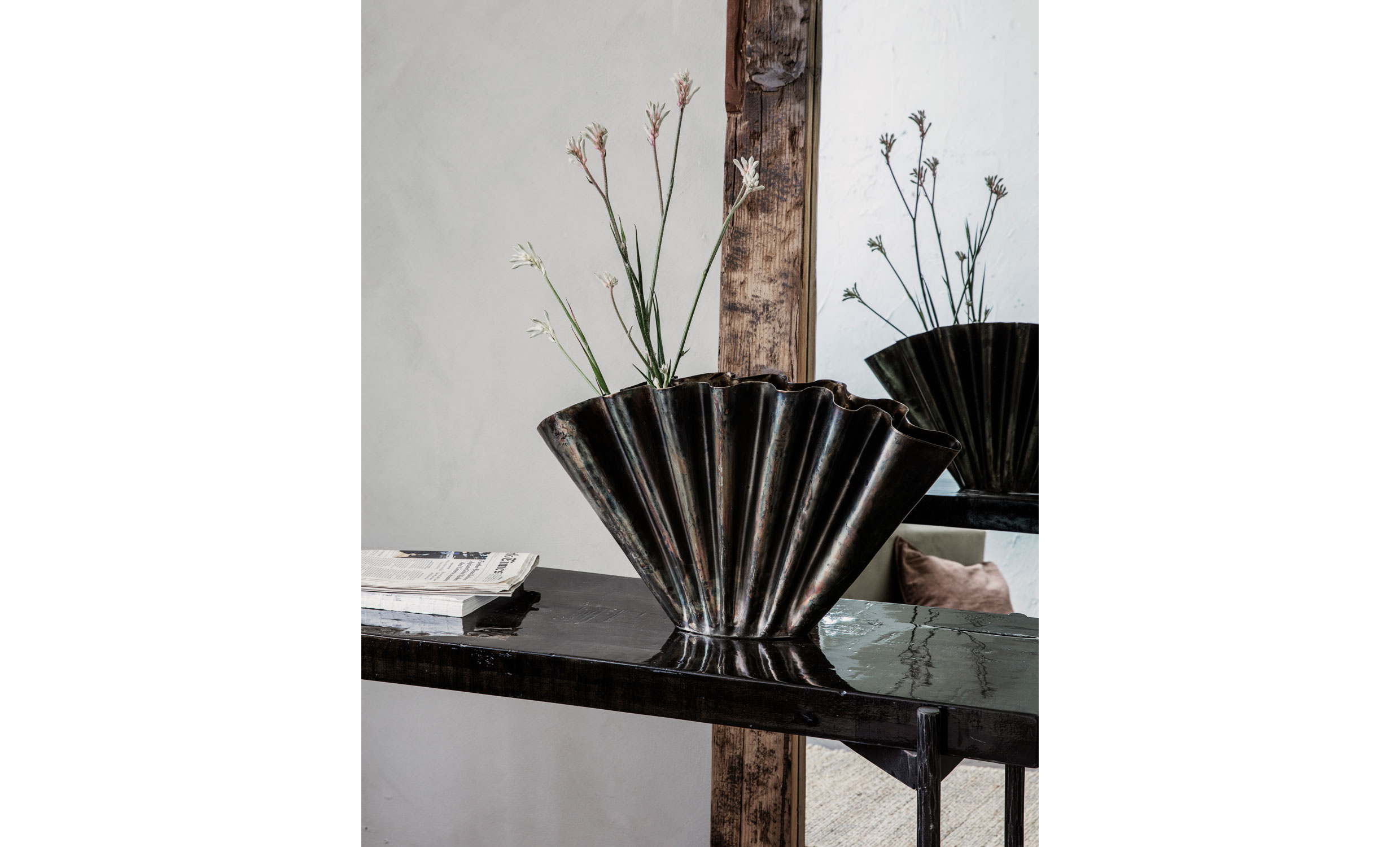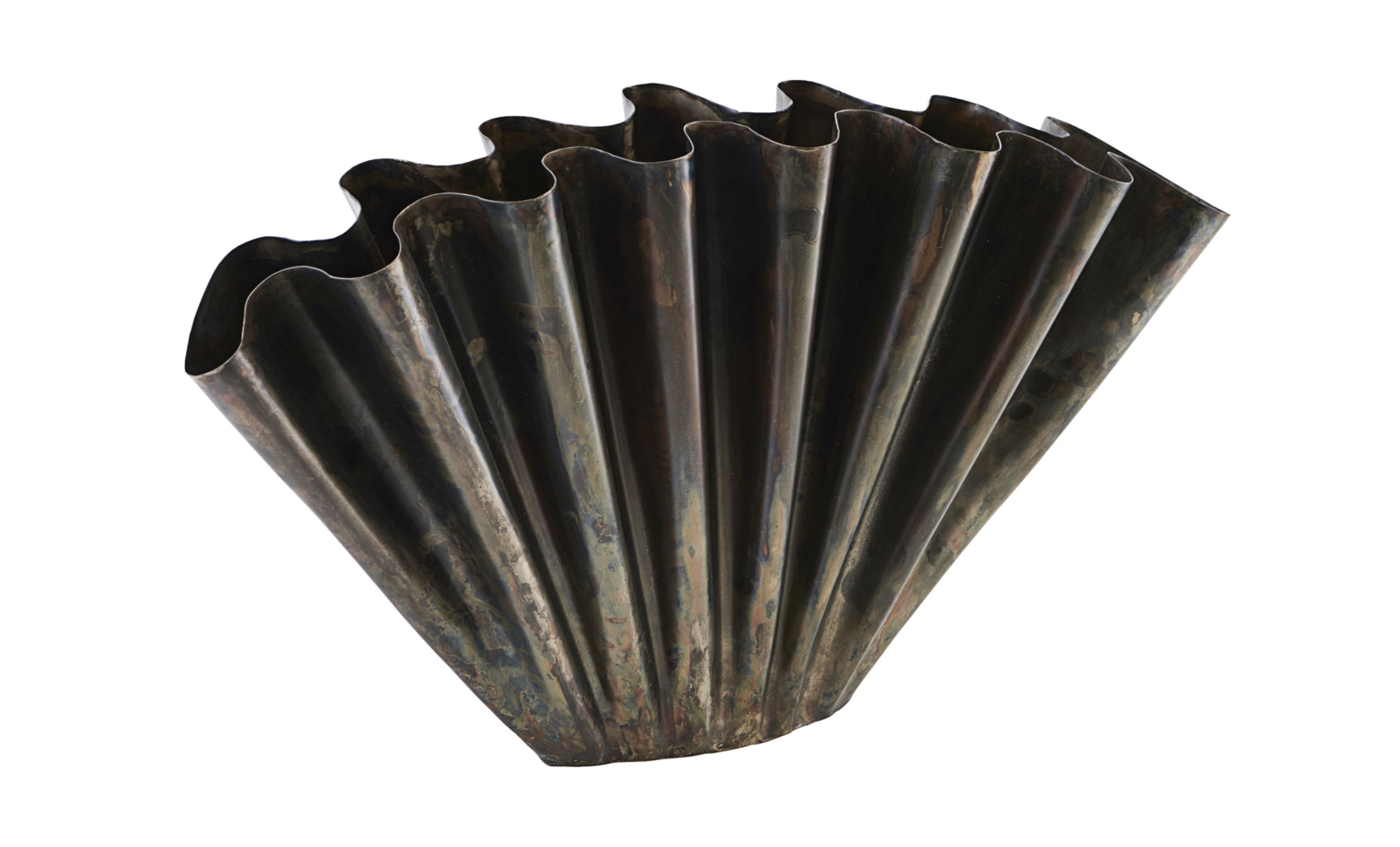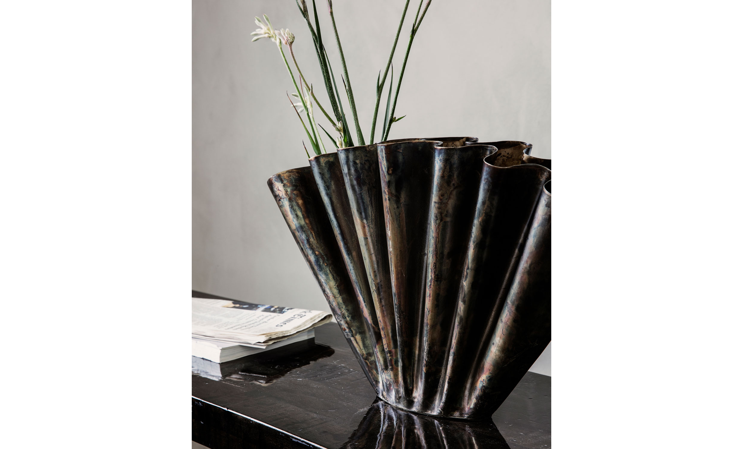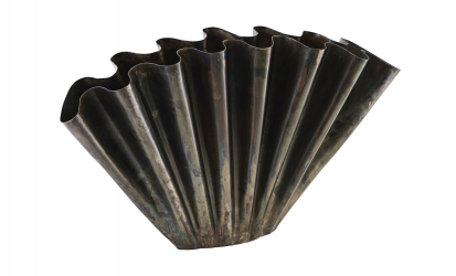 Flood är en unik och uttrycksfull inredningsdetalj som förenar rustik charm med modern design. Tillverkad i järn med en antik brun finish som ger en varm och levande yta. De karakteristiska vikningarna skapar en skulptural form som fångar ljuset vackert och ger vasen ett dynamiskt uttryck. Perfekt som solitär eller fylld med säsongens blommor.