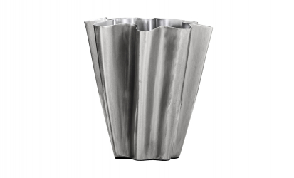 Flood är en handgjord vas som förenar rå industriell känsla med modern elegans. Den vågformade designen ger en levande struktur, medan den borstade silverytan reflekterar ljuset på ett subtilt och stilfullt sätt. Perfekt som solitär på ett sidobord eller som vas för säsongens blommor.