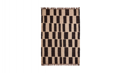 Denna handgjorda matta i svart och naturtoner ger ditt rum karaktär och värme. Det asymmetriska mönstret skapar ett modernt uttryck, medan blandningen av ull och jute ger en mjuk men naturlig känsla. De dekorativa fransarna sätter pricken över i och ger mattan ett levande och stilfullt utseende.