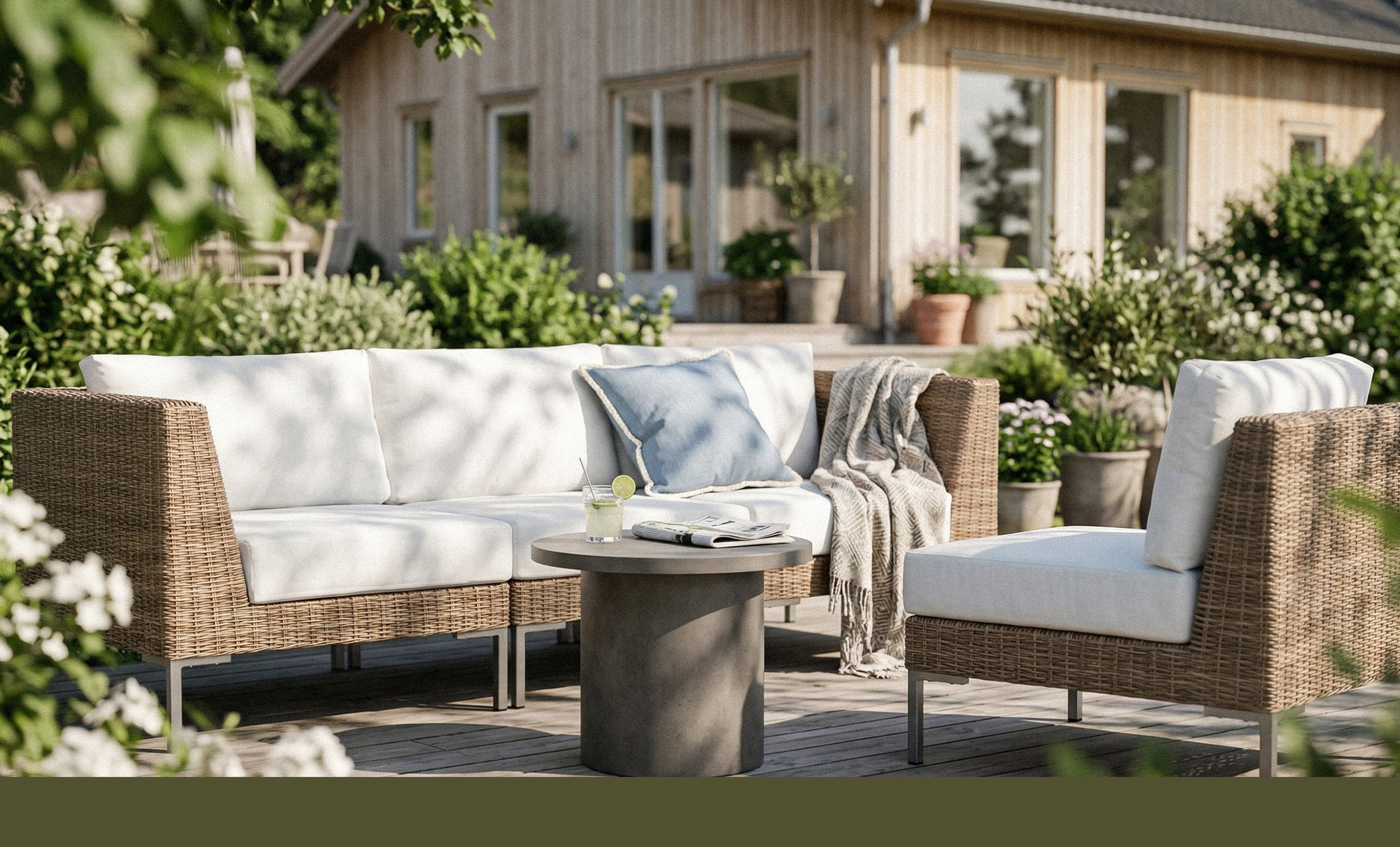 Greenville är en tjusig och bekväm modulsoffa gjord i konstrotting som är perfekt att slå sig ner på för avkoppling och som står sig fint i trädgården eller uterummet. Soffan är gjord i konstrotting vilket gör den väderbeständig. Sittplymåerna och kuddarna är klädda i ett tyg av polyester. Modulsoffan består av en fåtölj och en soffa M. Låt delarna stå för sig själva eller sätt ihop det till en soffa L.