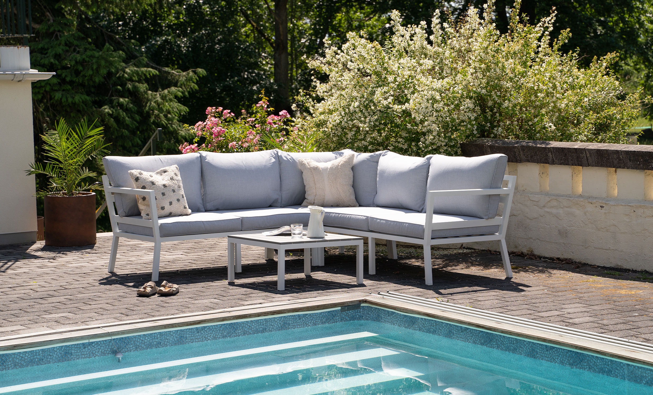 Med sitt stilrena, skandinaviska utseende är Grinda loungegrupp det självklara valet för loungemöbler. Gruppen utgörs av en soffa och ett bord. Soffan består av en hörndel och två 2-sitsdelar. Bordet är tillverkat av aluminium och polywood. Polywood är ett bra miljöval tillverkat av återvunnen plast som sammanpressats och formats till ”träliknande” plankor - vädertåligt, vattentåligt och underhållsfritt. Sätt dig och njut av en härlig frukost i solen, eller prata med nära och kära långt in på natten. Denna loungegrupp passar lika bra i uterummet som i trädgården. Vi rekommenderar att använda möbelskydd när möblerna inte används för att skydda mot väder och vind.