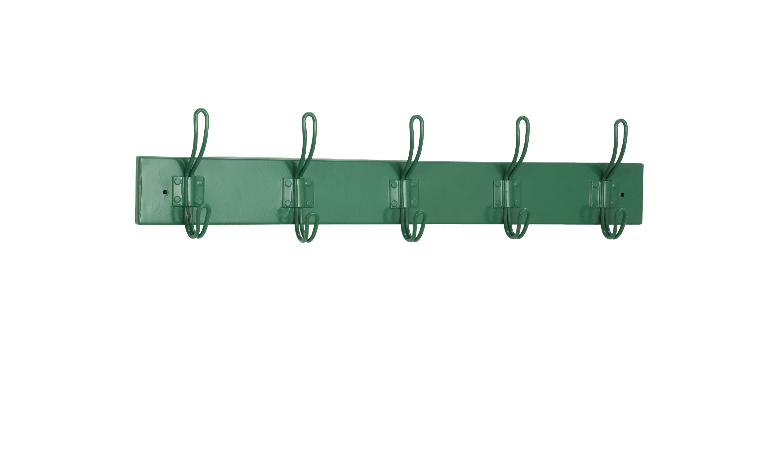 Denna väggkrok i grön pulverlackerad järn kombinerar funktion med stilren design. De fem dubbla krokarna ger smart och platsbesparande förvaring för jackor, väskor eller andra vardagsdetaljer. Den robusta konstruktionen ger stabilitet och gör den enkel att montera på väggen – perfekt för hall, kontor eller butik.