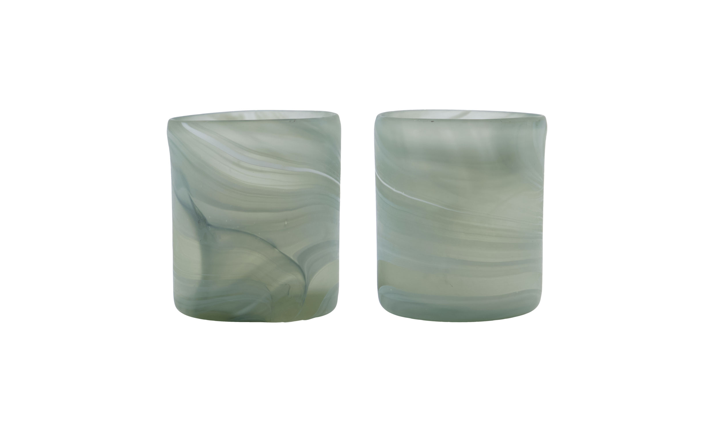 Skapa ett varmt och inbjudande sken med dessa två eleganta värmeljushållare i munblåst glas. Det marmorerade mönstret ger varje hållare en unik karaktär och tillför lugn och elegans till inredningen. Perfekta på soffbordet, i vardagsrummet eller som stämningsfull detalj på middagsbordet.