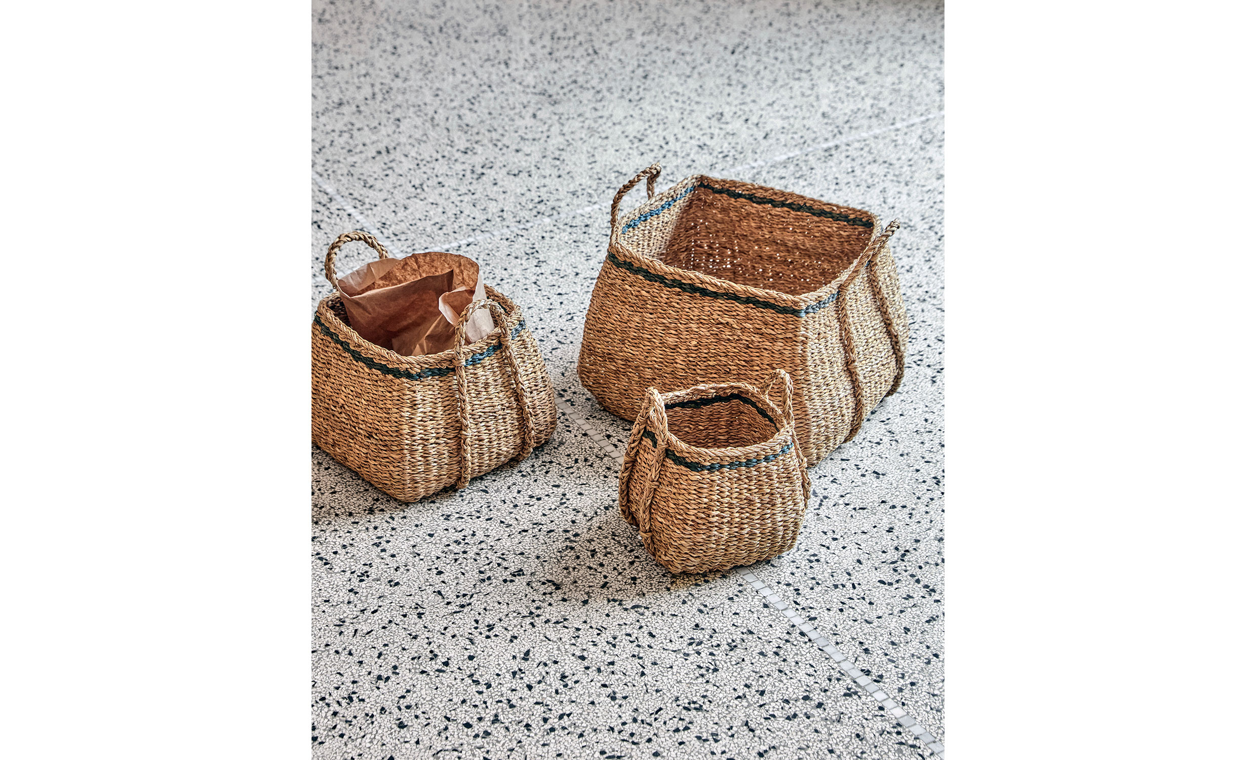 Dessa handvävda förvaringskorgar i sjögräs tillför både värme, struktur och smart förvaring till hemmet. De mjuka naturtonerna kombineras med en markerad svart rand längs kanten som ger korgarna ett stilrent och grafiskt uttryck. Den robusta konstruktionen och de dubbla handtagen gör dem enkla att lyfta och flytta, medan de tre olika storlekarna gör dem perfekta för allt från filtar och leksaker till tvätt.