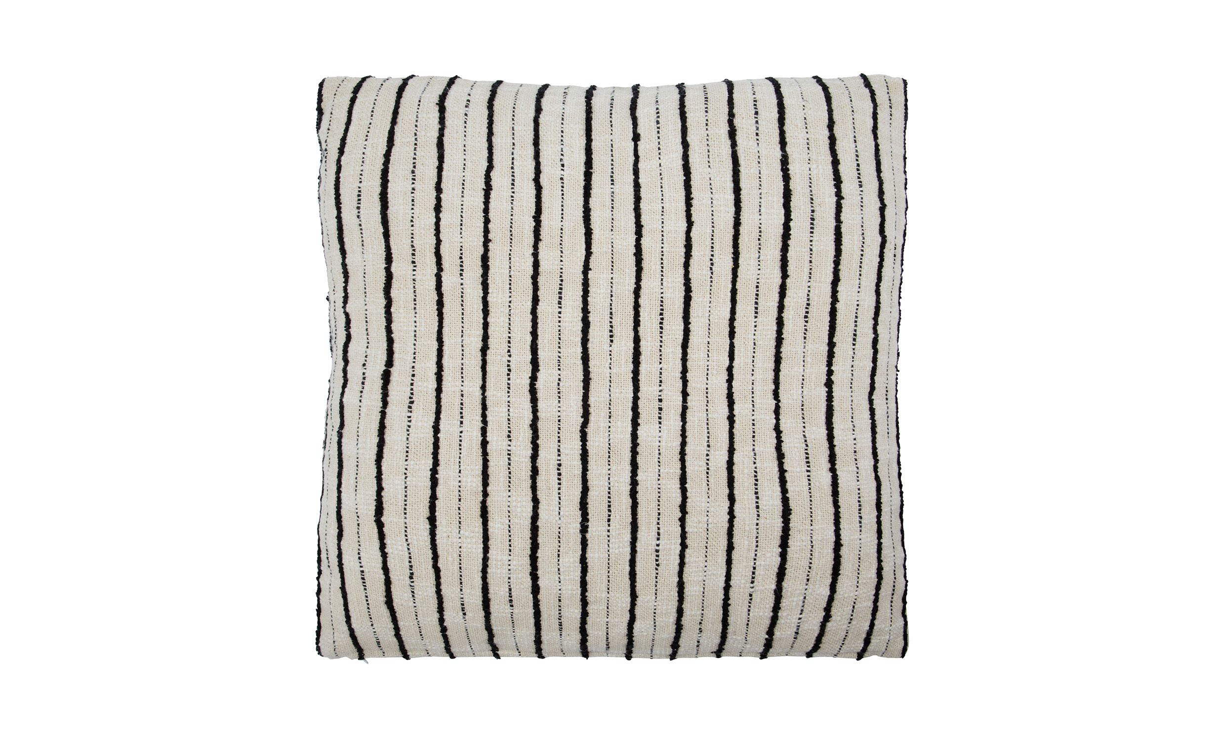 Detta handvävda kuddfodral i svart och offwhite ger soffan, fåtöljen eller sängen ett varmt och stilrent uttryck. Den mjuka bomullsblandningen och de enkla ränderna skapar en tidlös design som passar perfekt i vardagen och är lätt att kombinera med andra kuddar.