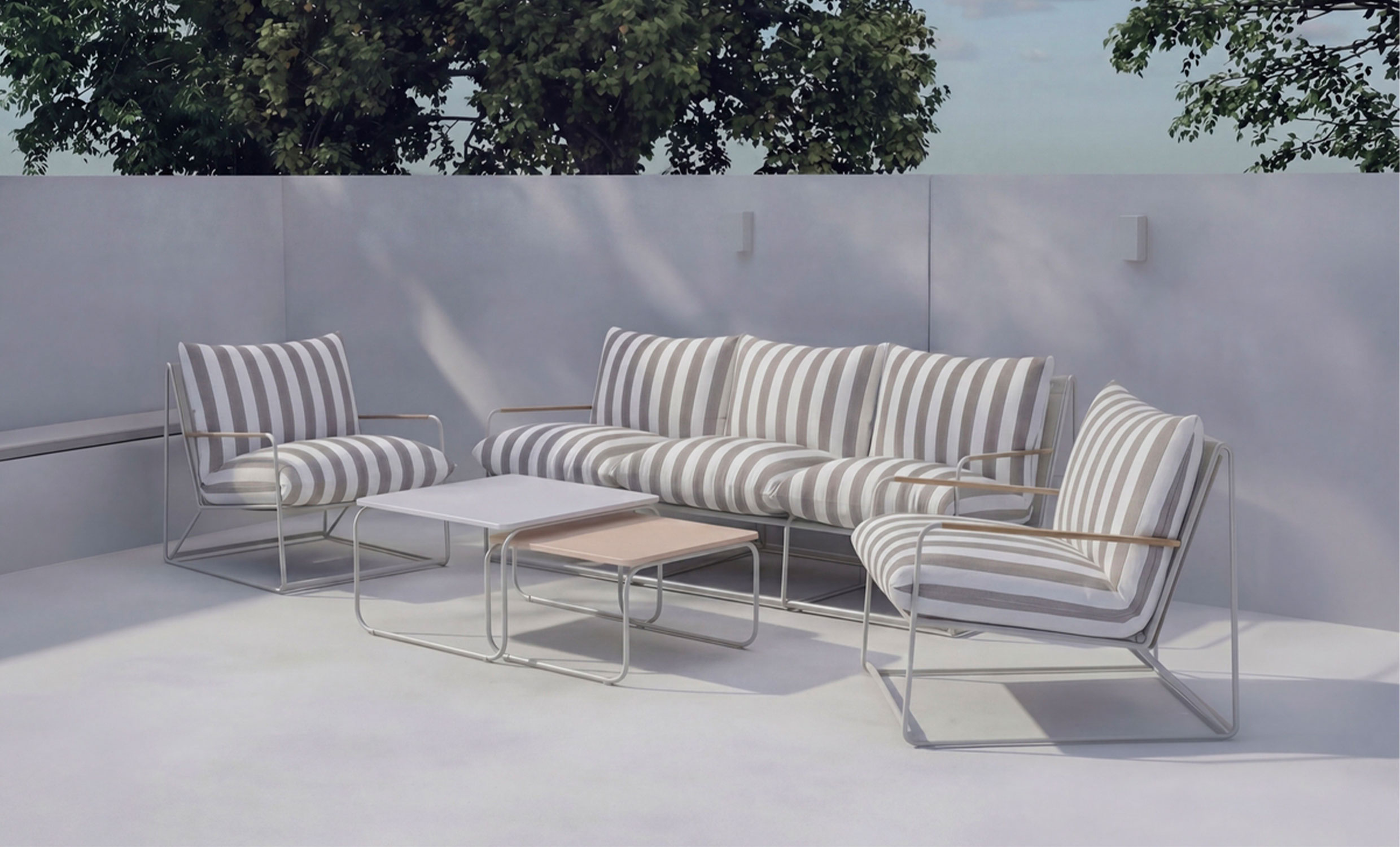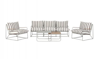 Liz är en soffgrupp som skapar en lyxig och inbjudande atmosfär på din uteplats och den är perfekt för avkoppling och sociala stunder. Gruppen består av två bekväma fåtöljer, en rymlig soffa och ett matchande bord som är designade för att ge både komfort och stil. Den stabila ramen i beiget stål ger en modern touch medan de mjuka beige dynorna erbjuder en behaglig sittupplevelse. Dynorna är tillverkade i slitstarkt textilene och polyester och är idealiska för utomhusbruk och enkla att underhålla.