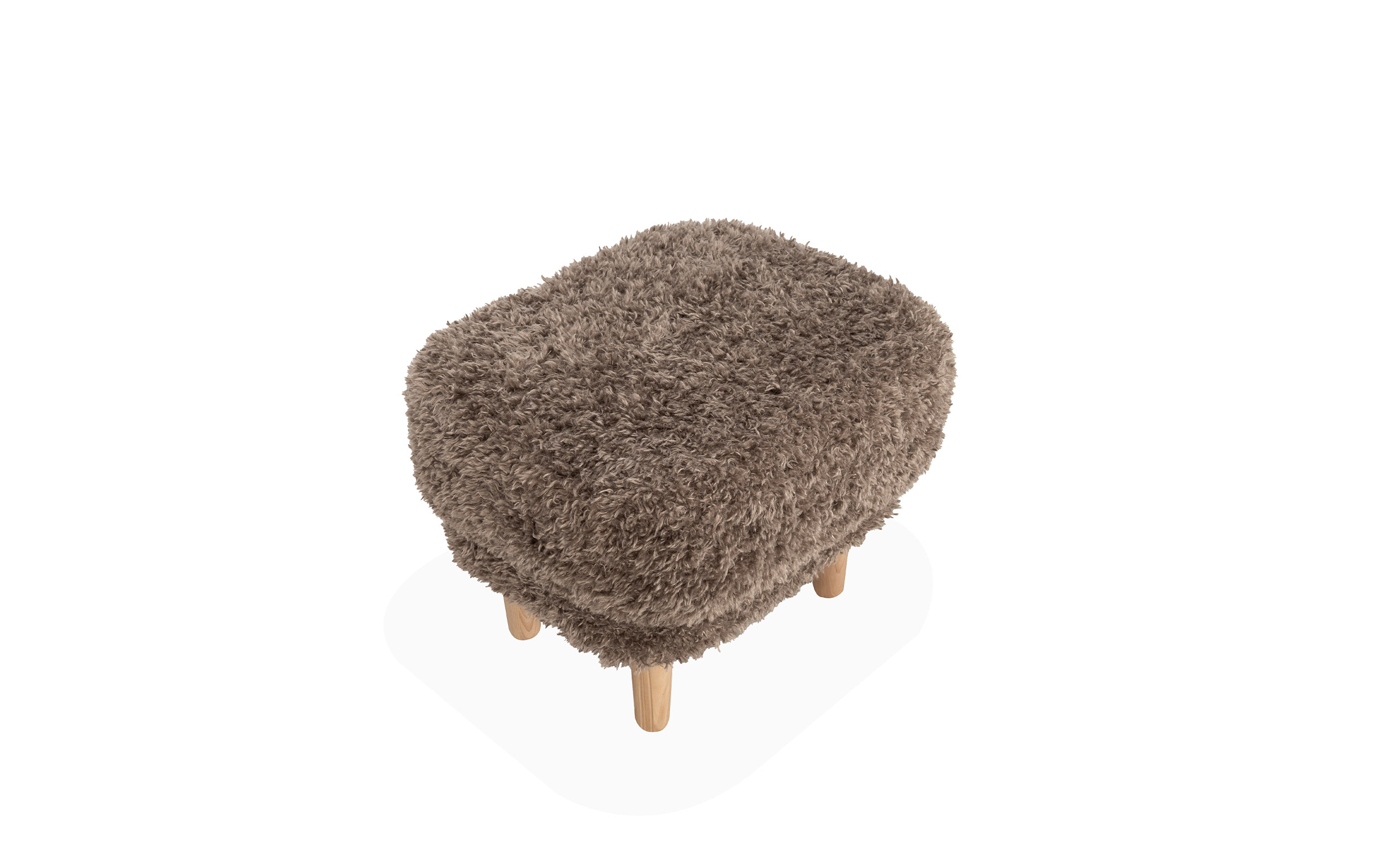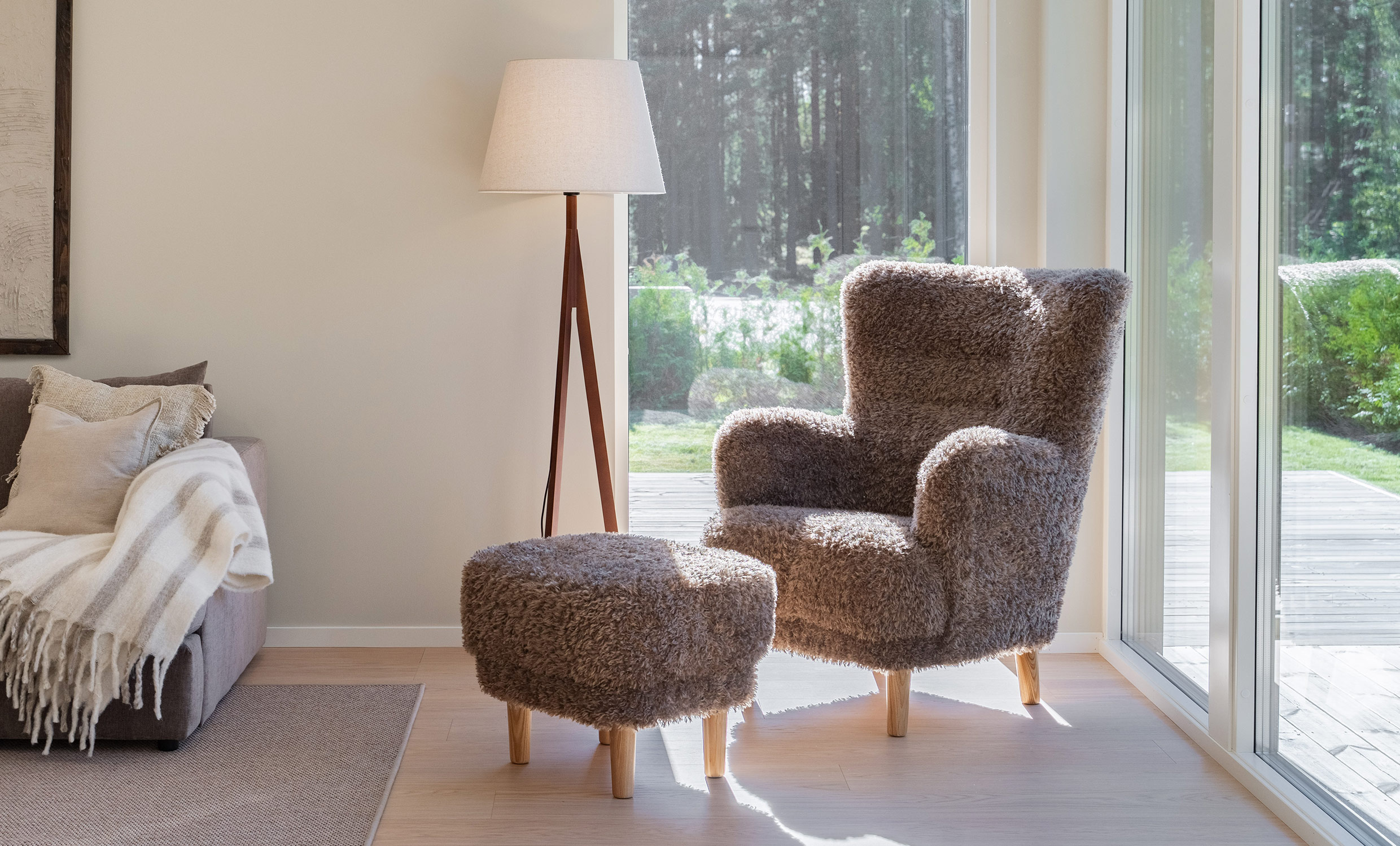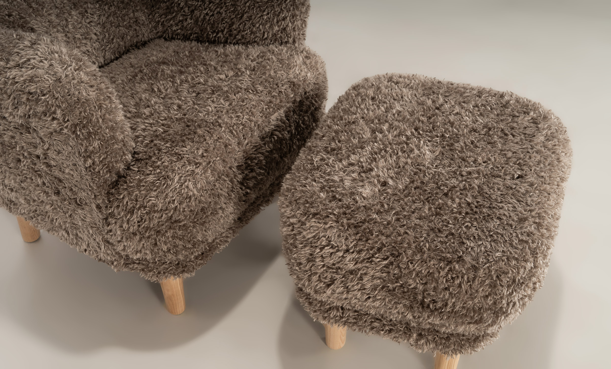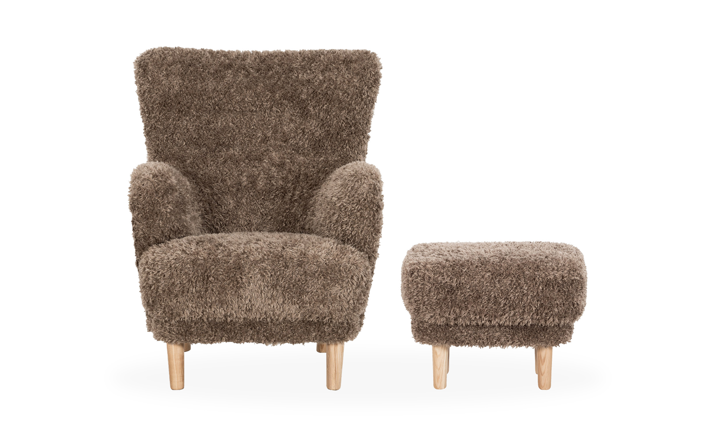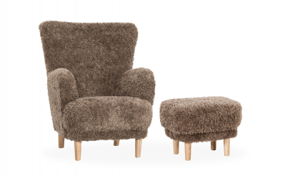 - Lova fåtölj och fotpall har en fast komfort, samt är klädda i ett tyg med fluffig yta.