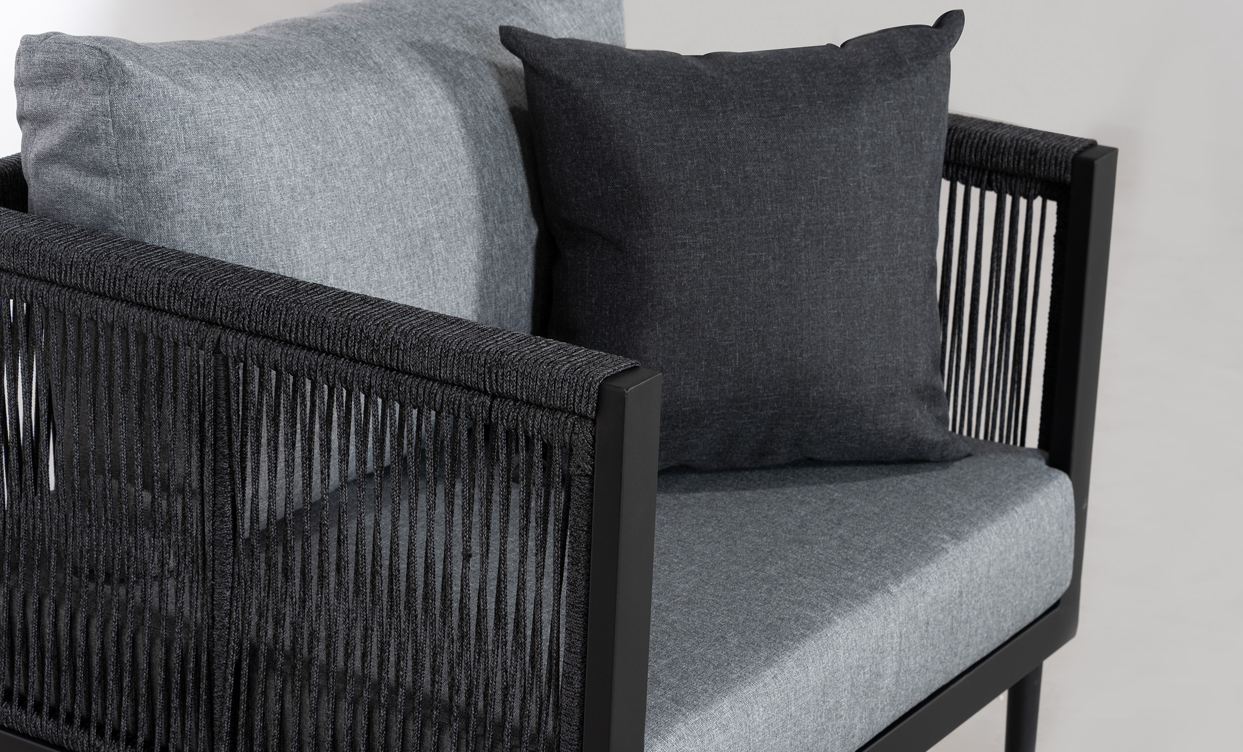Lugano är en härlig trädgårdsfåtölj som passar utmärkt att tillbringa sin lediga tid på i uterummet eller trädgården. Stommen består av rep samt galvaniserad stål. Kuddarna och dynorna är klädda i ett tyg av polyester.