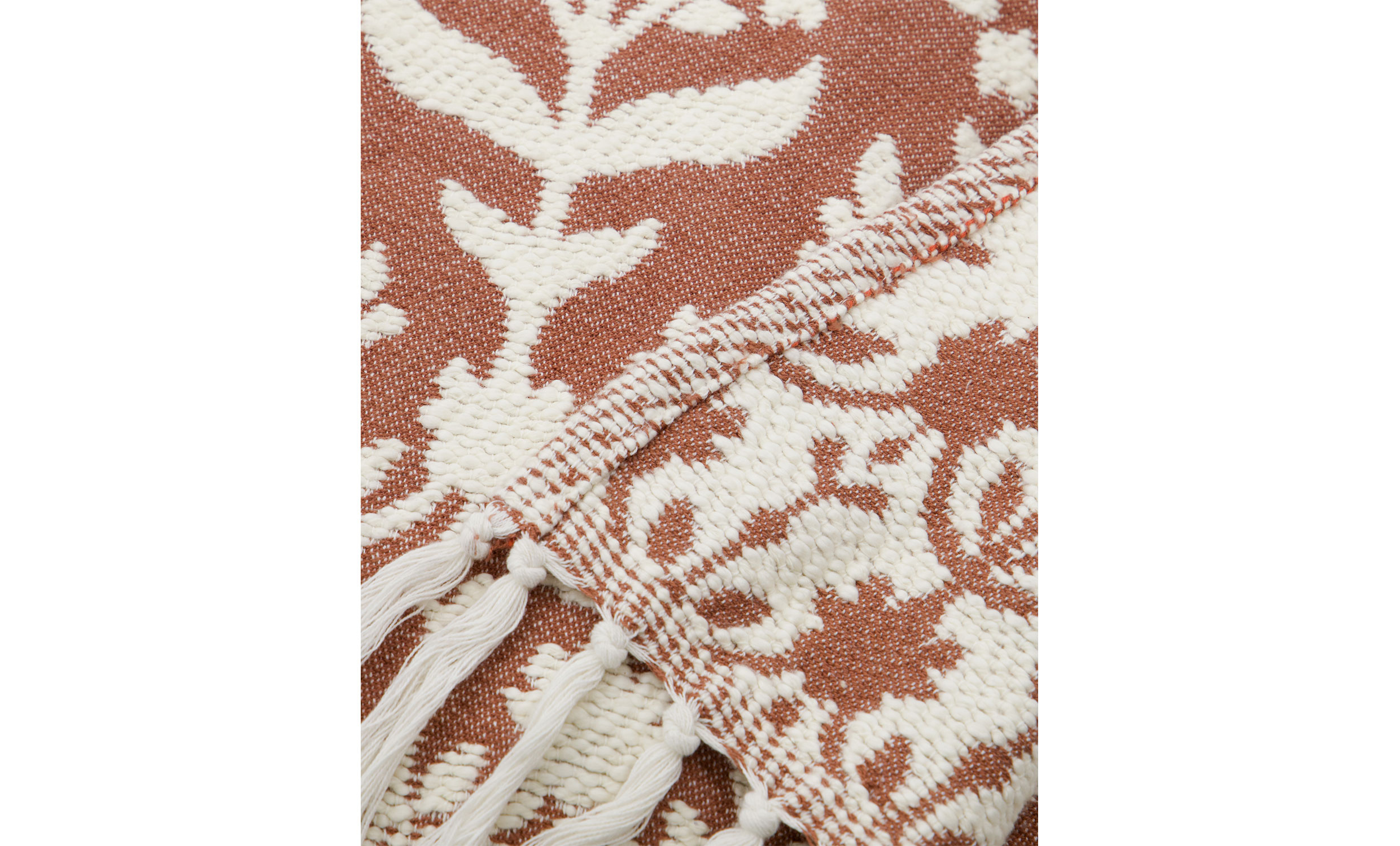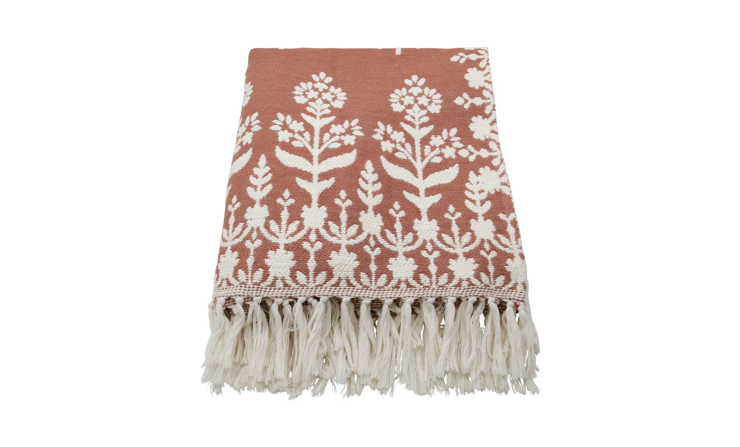 Mazzo överkast är vävd i mjuk bomull och kommer i en terrakottabrun nyans med handgjorda detaljer som ger ett personligt och ombonat uttryck. Överkastets mönster skapar en vacker kontrast och tillför både karaktär och värme. Lägg överkastet över soffan för en färgklick eller använd den som ett extra lager på sängen för en mjuk och inbjudande känsla.