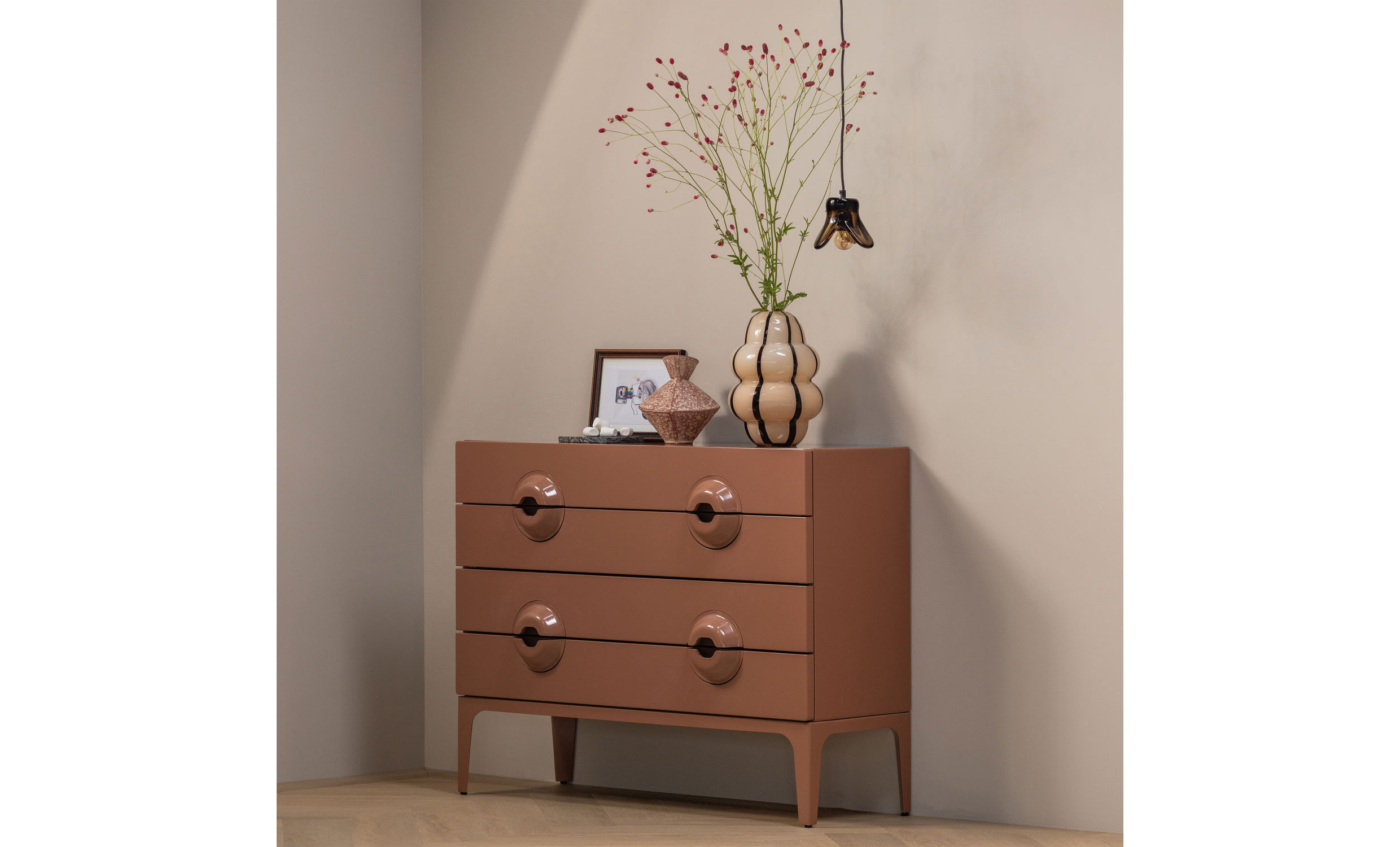 Merge är en snygg byrå med retrokänsla från WOOOD. Med sina fyra rymliga lådor och unika handtag kombinerar den smart förvaring med ett stilfullt uttryck, en lika praktisk som dekorativ möbel som passar i de flesta hem.