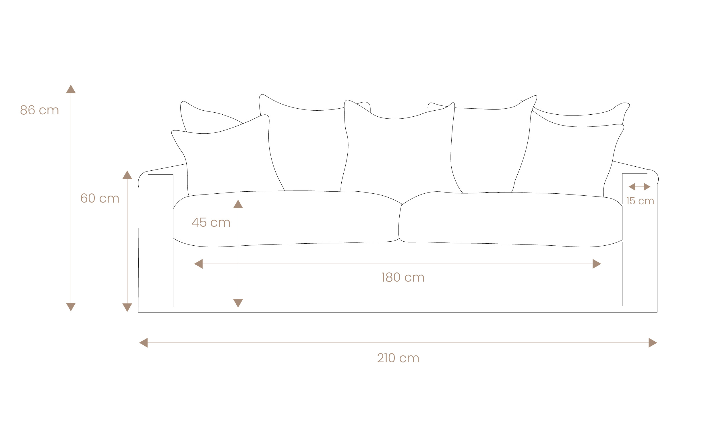 - Soffans ryggstöd består av sex större (55x55) och två mindre (40x40) kuvertkuddar i silikon och rivet kallskum som kan placeras efter eget behag.