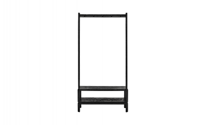 Denna handgjorda klädhängare i borstat svart mangoträ kombinerar praktisk förvaring med ett uttrycksfullt formspråk. Med fem krokar på vardera sida och två hyllplan får du gott om plats för ytterkläder, skor, väskor och korgar. Den kraftfulla designen ger rummet en avslappnad, bohemisk känsla samtidigt som hallen eller sovrummet hålls organiserat.