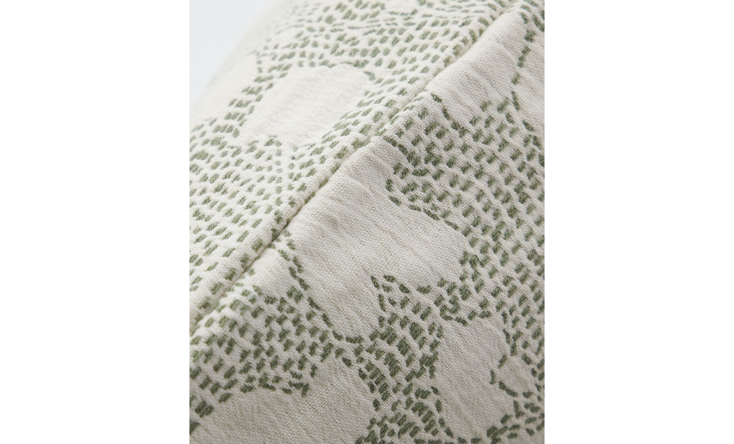 Mori kuddfodral är tillverkat i mjuk bomull och kombinerar en fint strukturerad khakifärgad bas med offwhite botaniska motiv. Den jacquardvävda ytan och den täta sömnaden skapar ett subtilt, tredimensionellt uttryck som ger kudden en elegant och genomarbetad känsla. En stilren detalj som tillför lugn och raffinerad textur till soffan eller sängen.