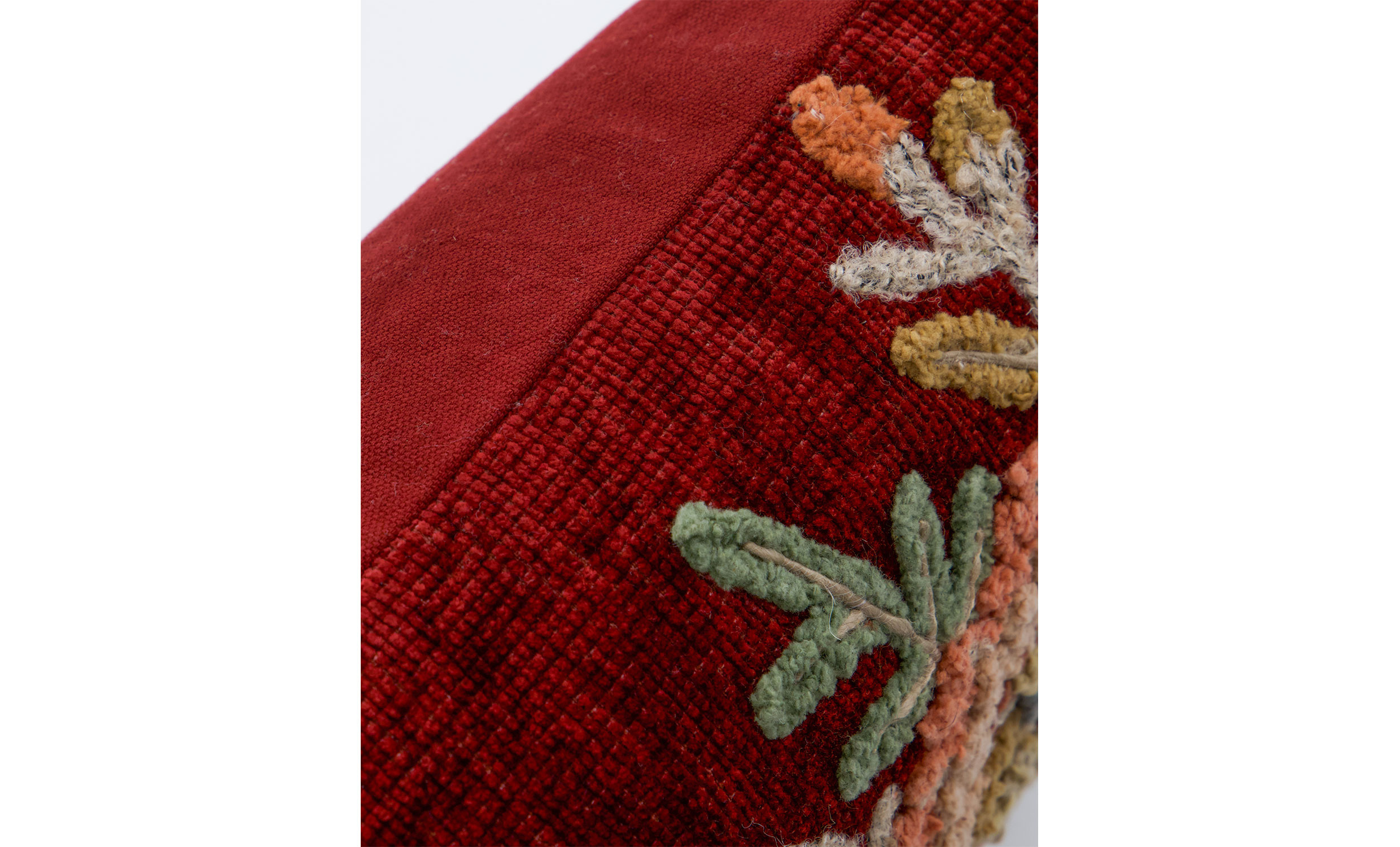 Nica kuddfodral är tillverkat i en mjuk blandning av bomull och viskos och pryds av ett rikt, detaljrikt broderi med floralt motiv. De röda och rosatonade nyanserna ger kudden ett varmt och elegant uttryck, medan den kraftiga broderingen tillför djup och hantverkskänsla. Ett dekorativt inslag som lyfter både soffan och sängen med färg och karaktär.
