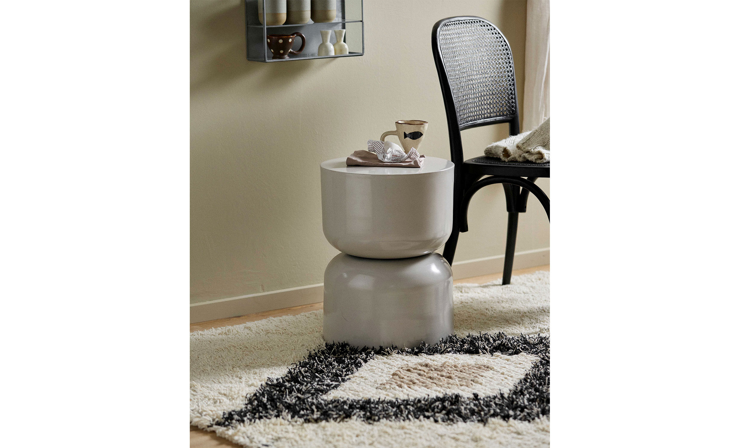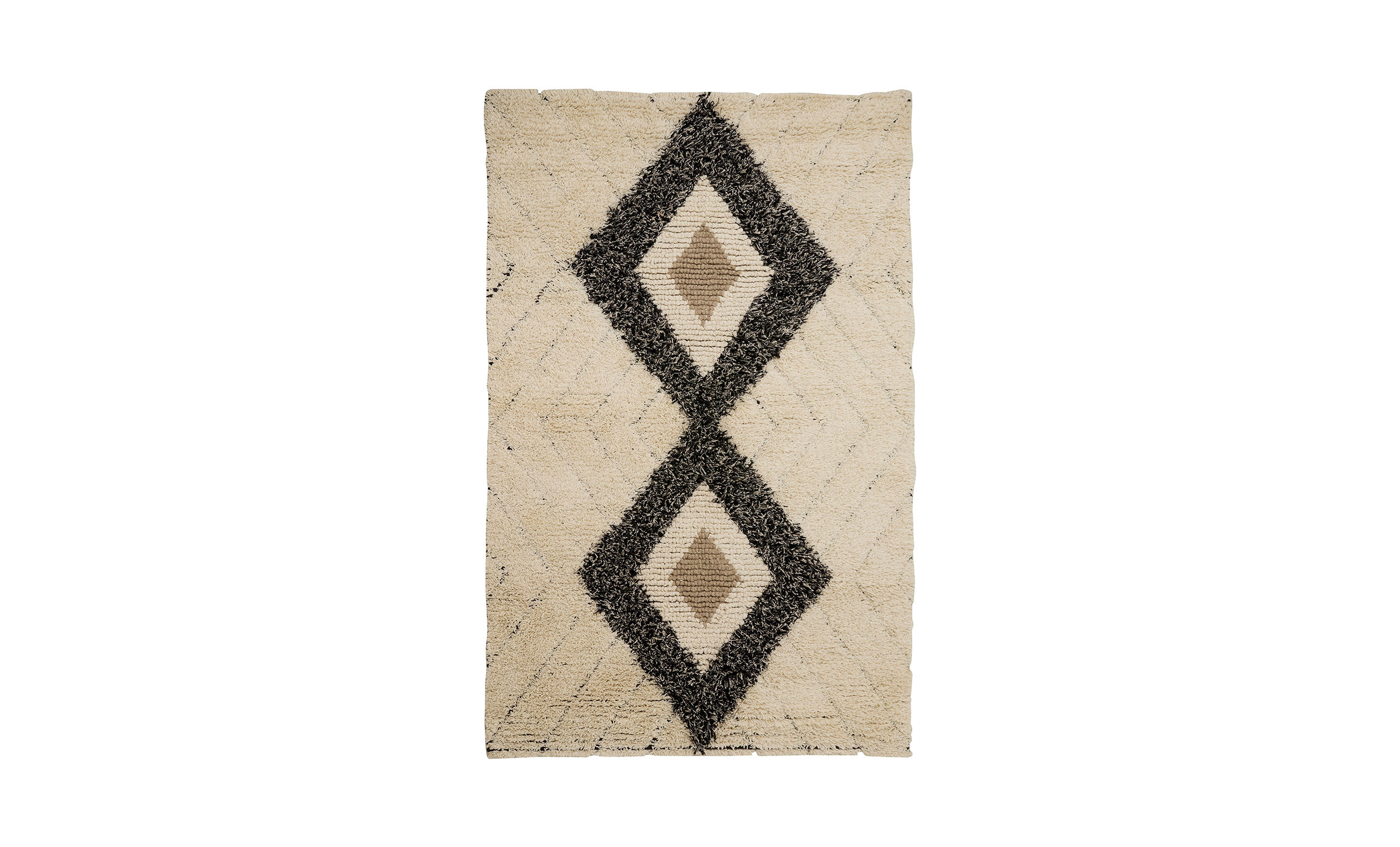 Nuha är en handgjord matta som tillför ett lugnt och taktilt uttryck till rummet. Den mjuka ullstrukturen kombineras med ett grafiskt mönster i elfenben och svart, vilket skapar en harmonisk balans mellan modern enkelhet och naturlig värme. Den täta luggen ger en behaglig, ombonad känsla under fötterna och passar lika fint i vardagsrum som i sovrum.
