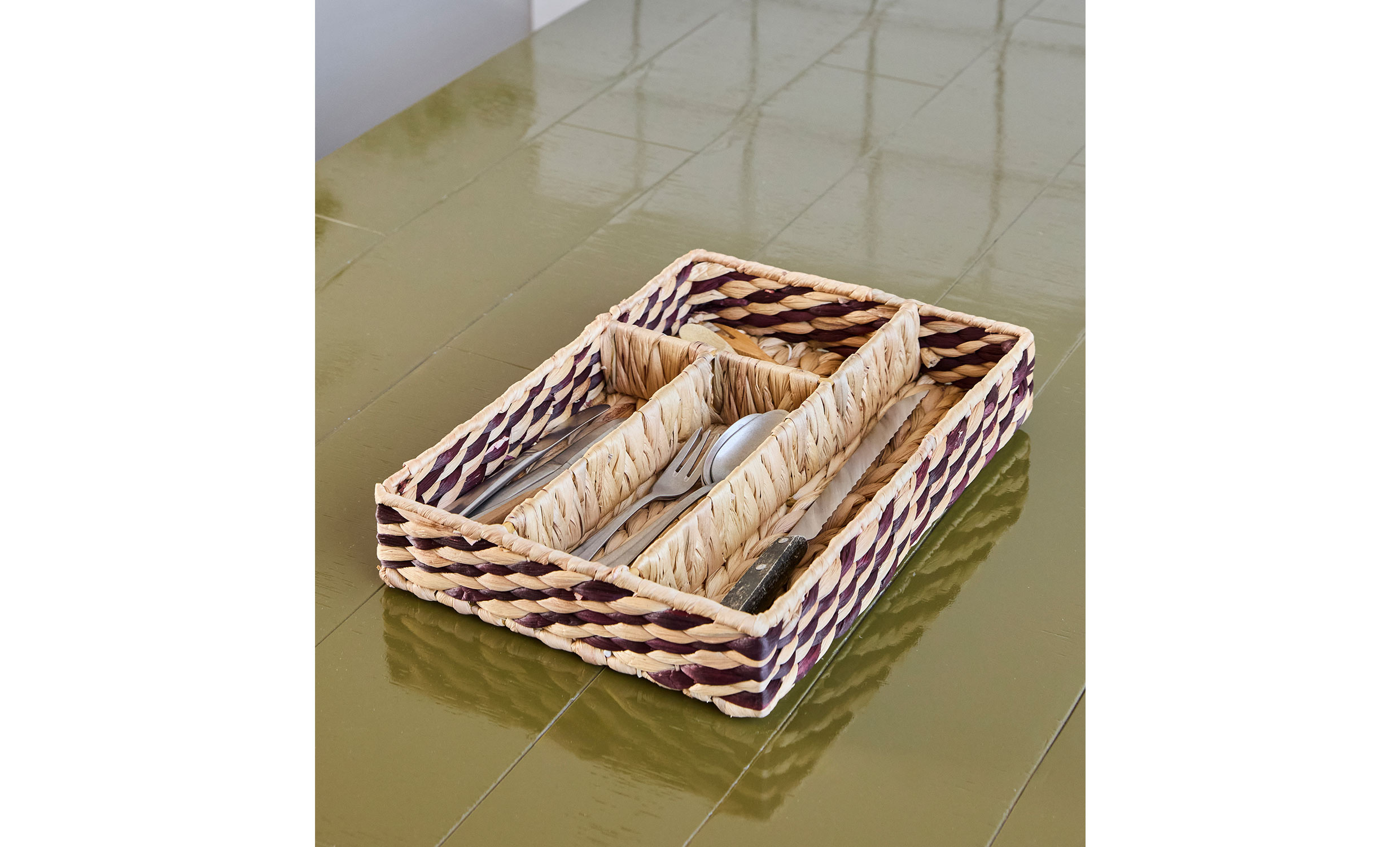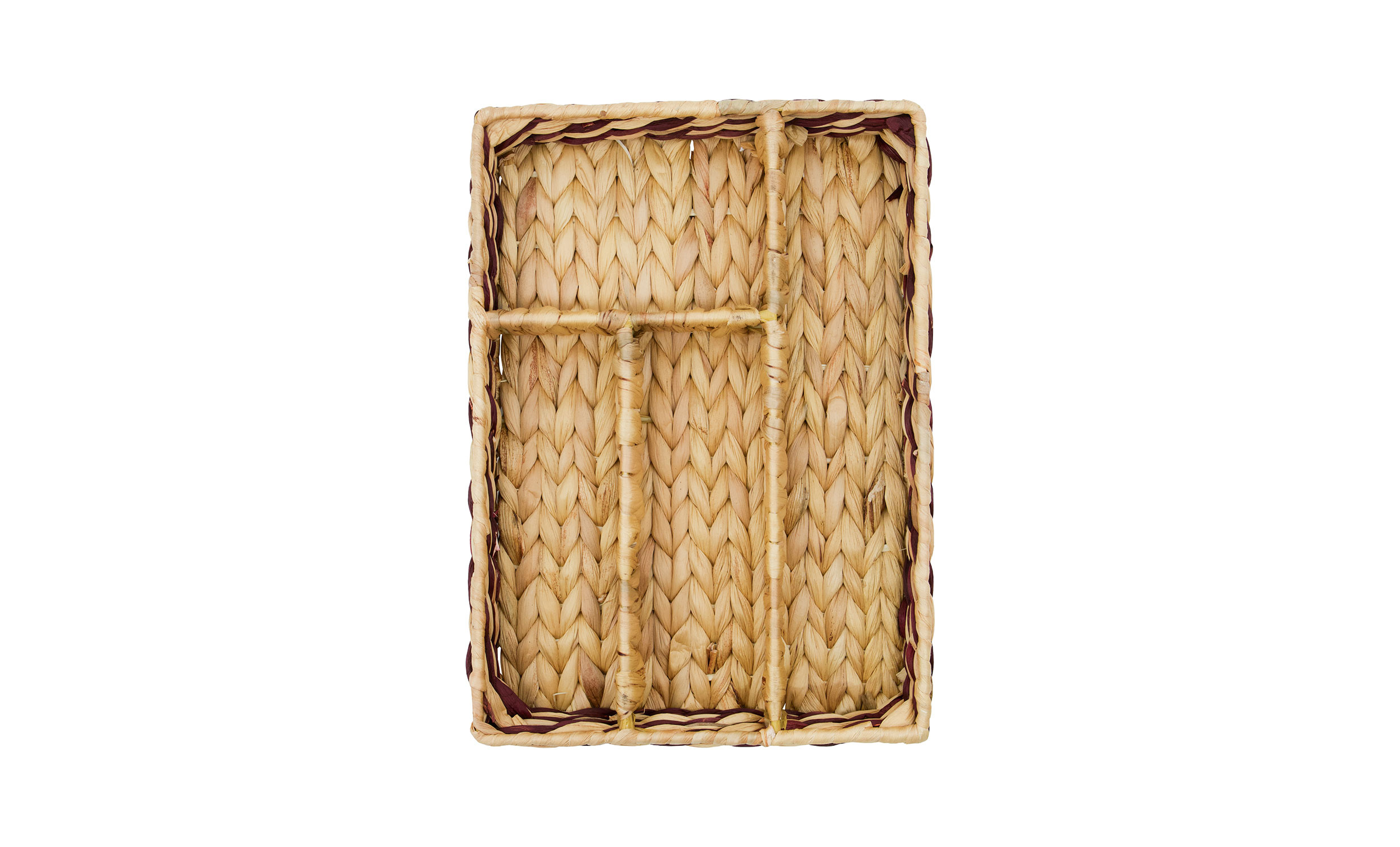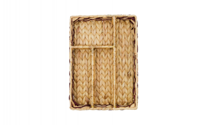Denna handvävda organiseringsbricka i vattenhyacint hjälper dig att hålla ordning på ett både praktiskt och dekorativt sätt. De fyra facken gör det enkelt att sortera mindre föremål, bestick eller köksredskap, medan det naturliga materialet med brun/naturfärgad rand ger ett varmt och tidlöst uttryck.