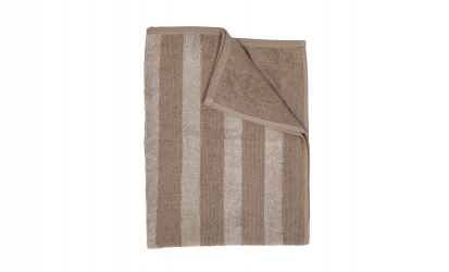Härlig frottéhandduk i en blandning av bomull och polyester där materialens olika egenskaper skapar en subtil och vacker randstruktur på framsidan. Vid infärgningen absorberar bomullen och polyestern färg på olika sätt, vilket resulterar i ett unikt och livfullt mönster. Baksidan är enfärgad och ger en harmonisk kontrast till den mönstrade framsidan.