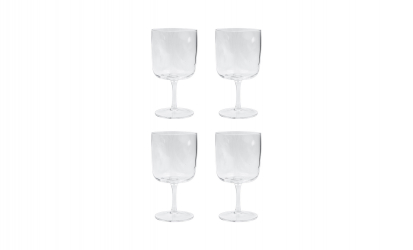 Detta set med fyra vinglas i munblåst, klart glas har en organisk silhuett och en stabil form som ger ett modernt och balanserat uttryck. Den strukturerade designen gör glasen lika dekorativa som funktionella och passar perfekt till både vardagliga middagar och festligare tillfällen.