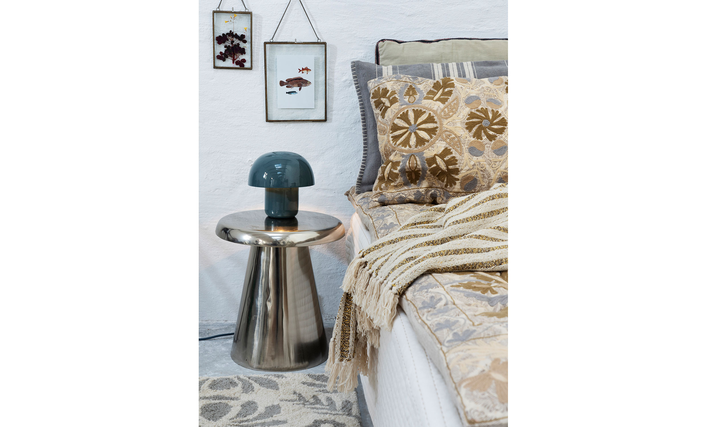 Detta emaljerade sidobord i blank stålgrå ton kombinerar modern metallkänsla med industriell karaktär. Det handemaljerade järnet ger en glansig och levande yta där mjuka former möter ett robust material. Placera det framför soffan tillsammans med andra mindre bord, eller låt det stå för sig själv med en växt eller lampa som dekorativ detalj.