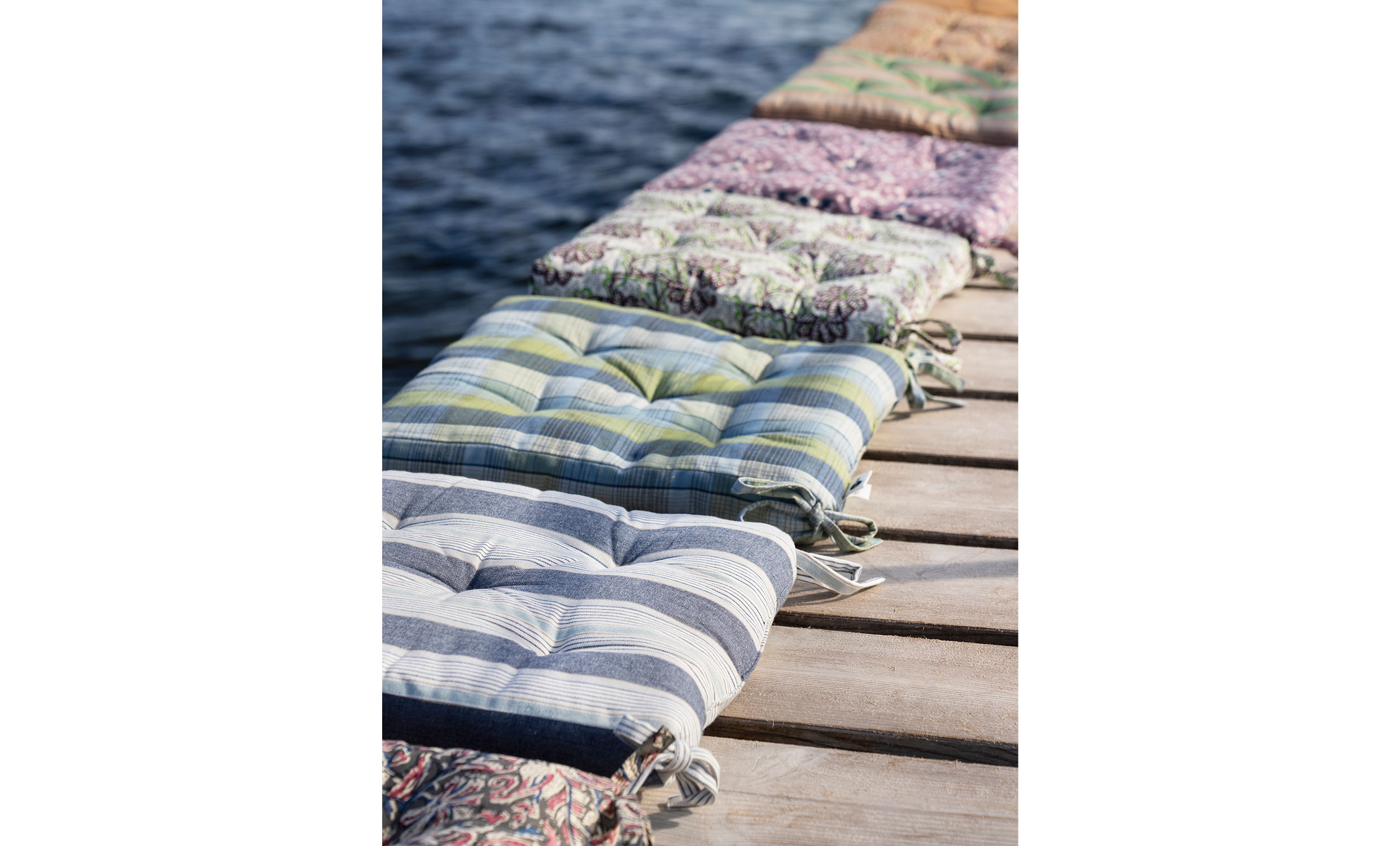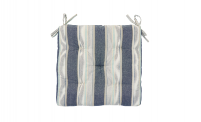 Denna randiga stolsdyna i bomull har ett dekorativt mönster i varierande bredder av blått, vitt och grått. Den harmonierar med matchande madrasser i serien och ger en mjukare och mer inbjudande sittplats – vid matbordet, i läshörnan eller ute i trädgården. Dynan är tillverkad i slitstark bomull, har praktiska knytband och är fylld med återvunna bomullsrester för bekväm och mer hållbar komfort.