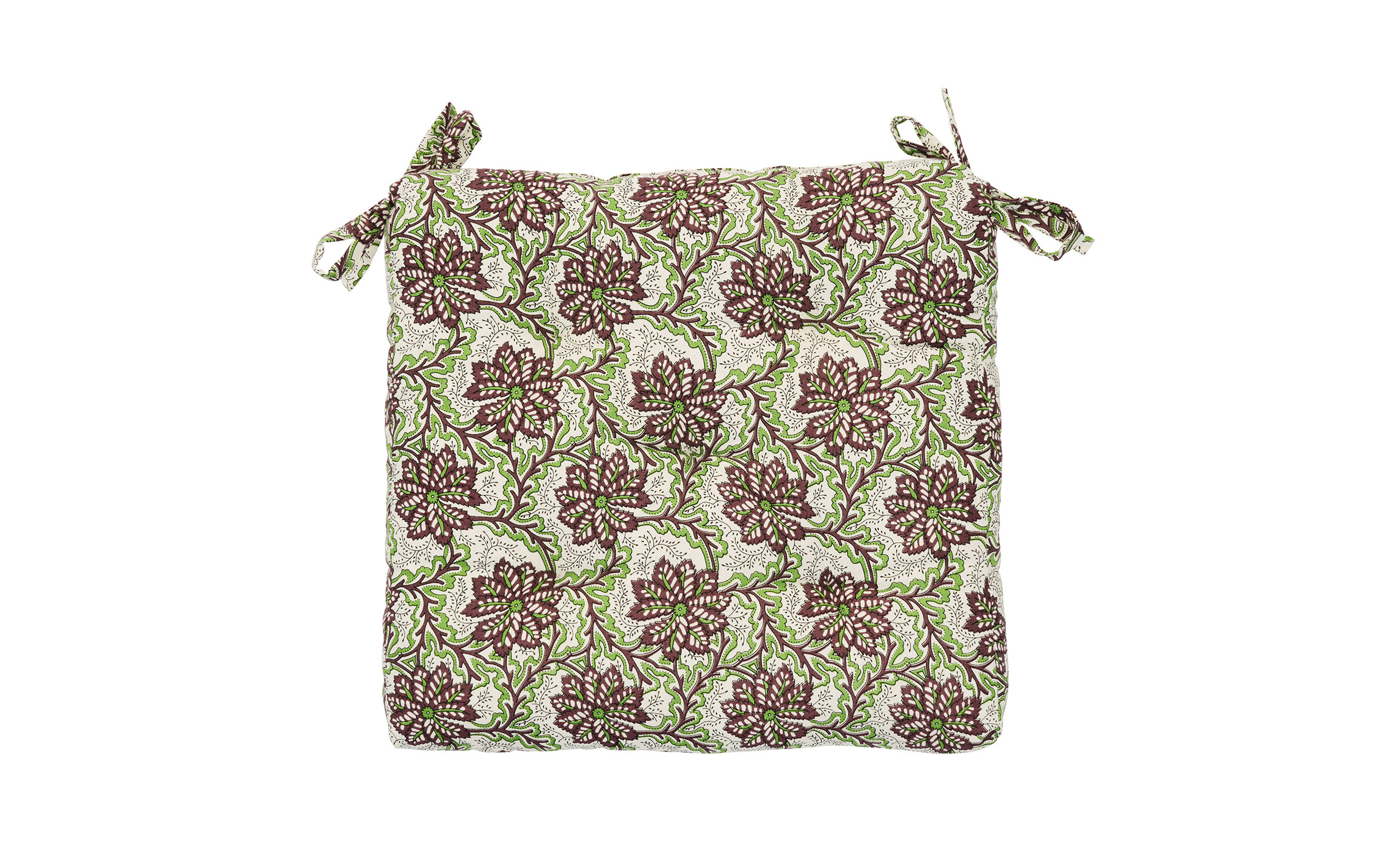 Ge din sittplats en naturlig och ombonad känsla med denna mönstrade stolsdyna i bomull. Det blommiga motivet i brunt, grönt och offwhite är inspirerat av traditionella indiska blocktryck och skapar ett varmt och levande uttryck. Dynan är tillverkad i slitstark bomull med bomullsfyllning och praktiska knytband som håller den stadigt på plats. Den passar de flesta stolar och matchar bänkdynan i samma serie för en enhetlig helhet.