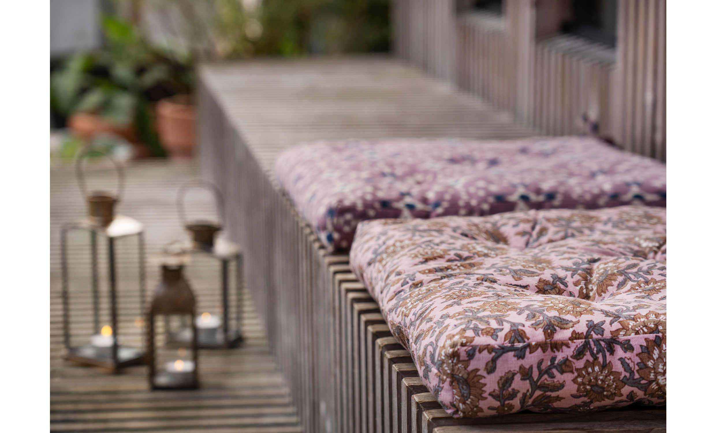 Denna stolsdyna i bomull har ett mjukt blommönster i varma toner av rosa, nougat och grått, inspirerat av traditionella indiska blocktryck. Det täta all-over-mönstret ger ett levande men balanserat uttryck som passar i både klassiska och moderna miljöer. Dynan är tillverkad i slitstark bomull, har praktiska knytband och är fylld med återvunna bomullsrester för bekväm och mer hållbar komfort. Passar de flesta stolar och mjukar upp sittplatser både inomhus och i trädgården.