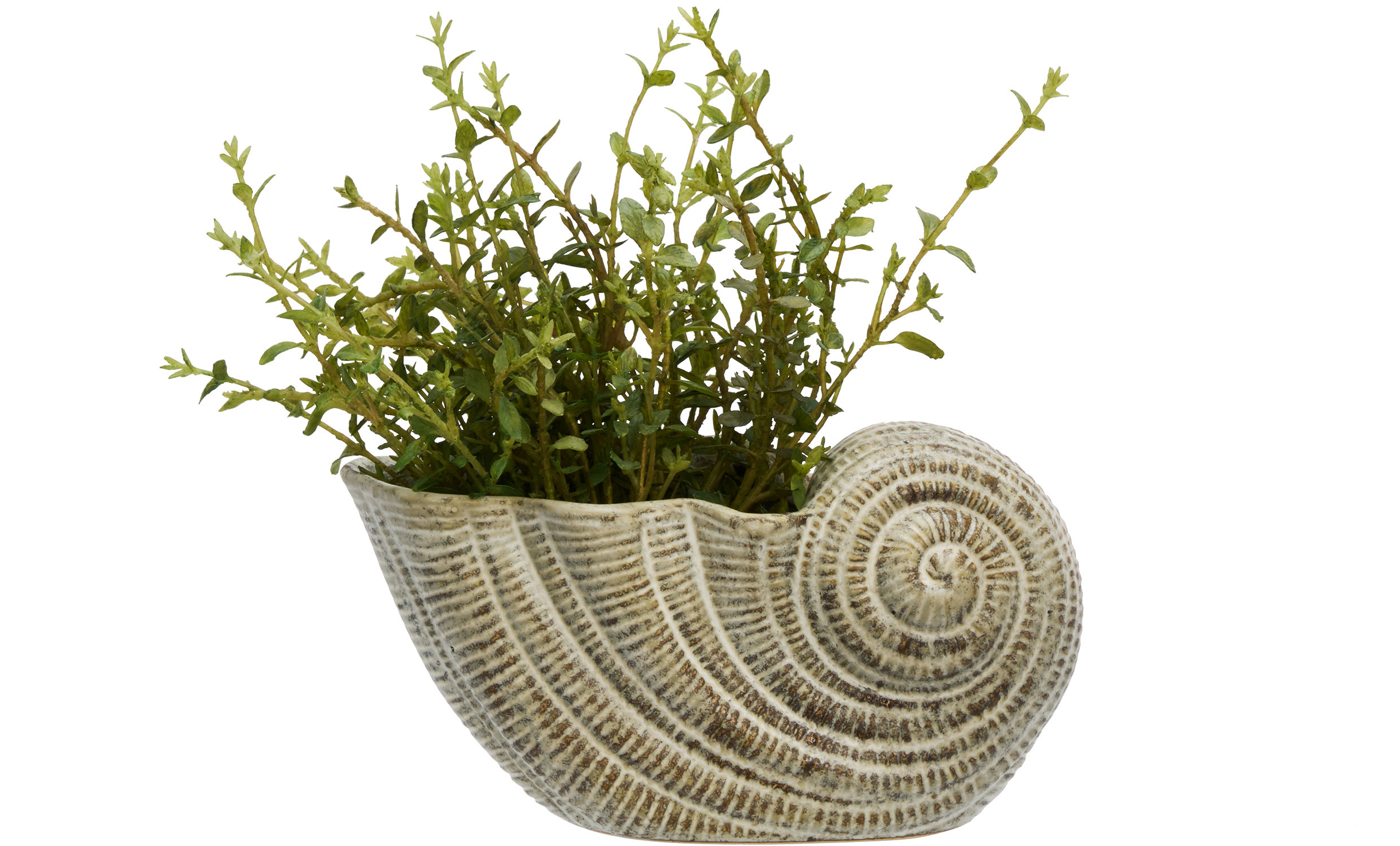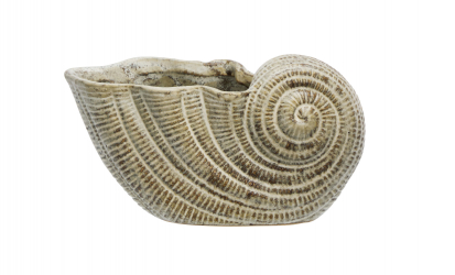 Denna skulpturala snäcka i stengods för in en subtil havskänsla i hemmet. I mjuka toner av offwhite och brunt skapar den ett naturligt och harmoniskt uttryck som passar lika fint på hyllan som på bordet. Den kan användas som dekorativ detalj i sig själv eller kompletteras med en mindre växt för ett personligt arrangemang. Glaseringen gör att färgintensitet och nyans kan variera något, vilket ger varje exemplar ett unikt uttryck.