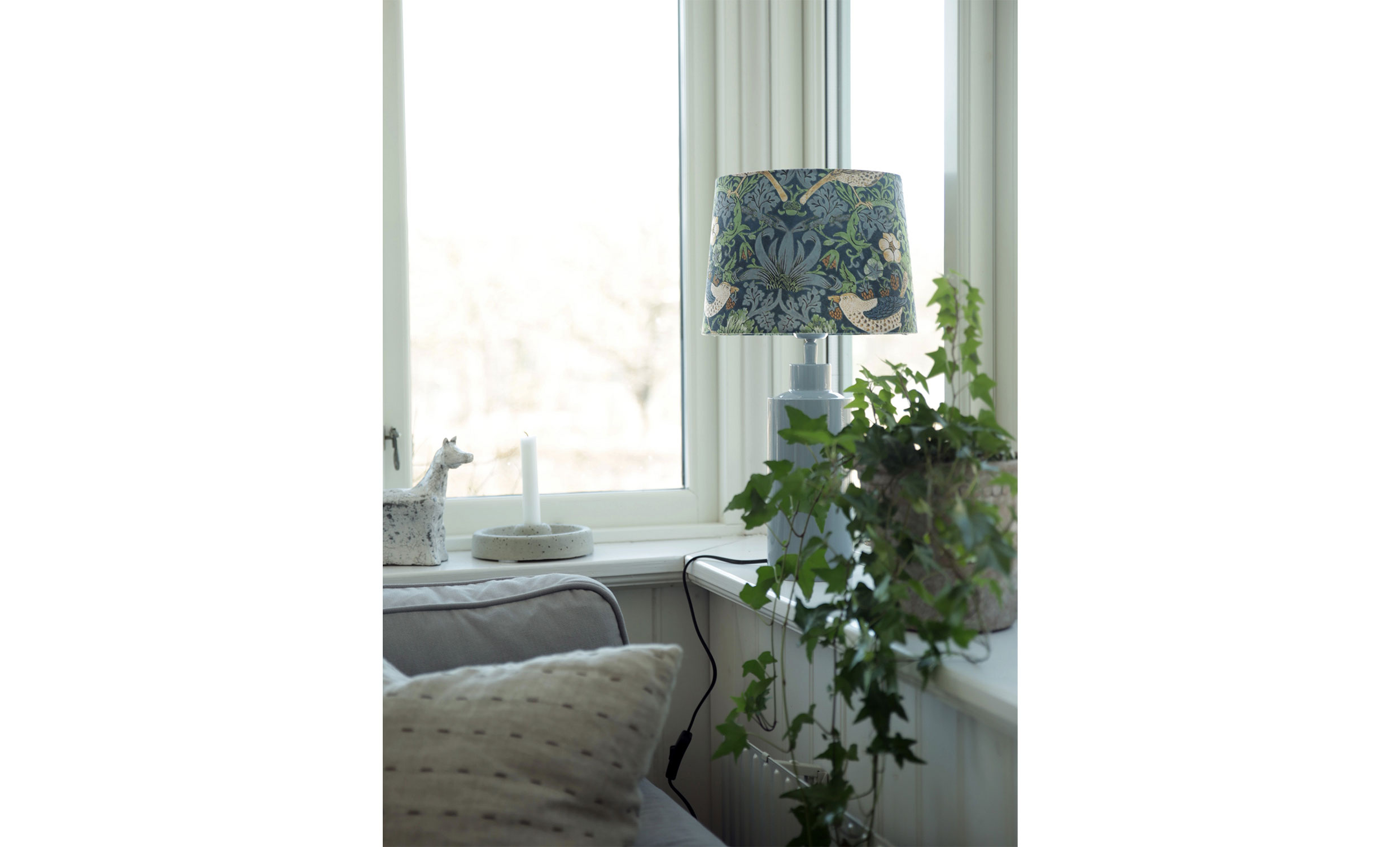 Solo är en elegant bordslampa i högblank denimblå finish som kombinerar klassisk form med en modern färgton. Den mönstrade tygskärmen skapar ett levande uttryck och sprider ett behagligt ljus, perfekt för att ge rummet en personlig och stilfull touch.